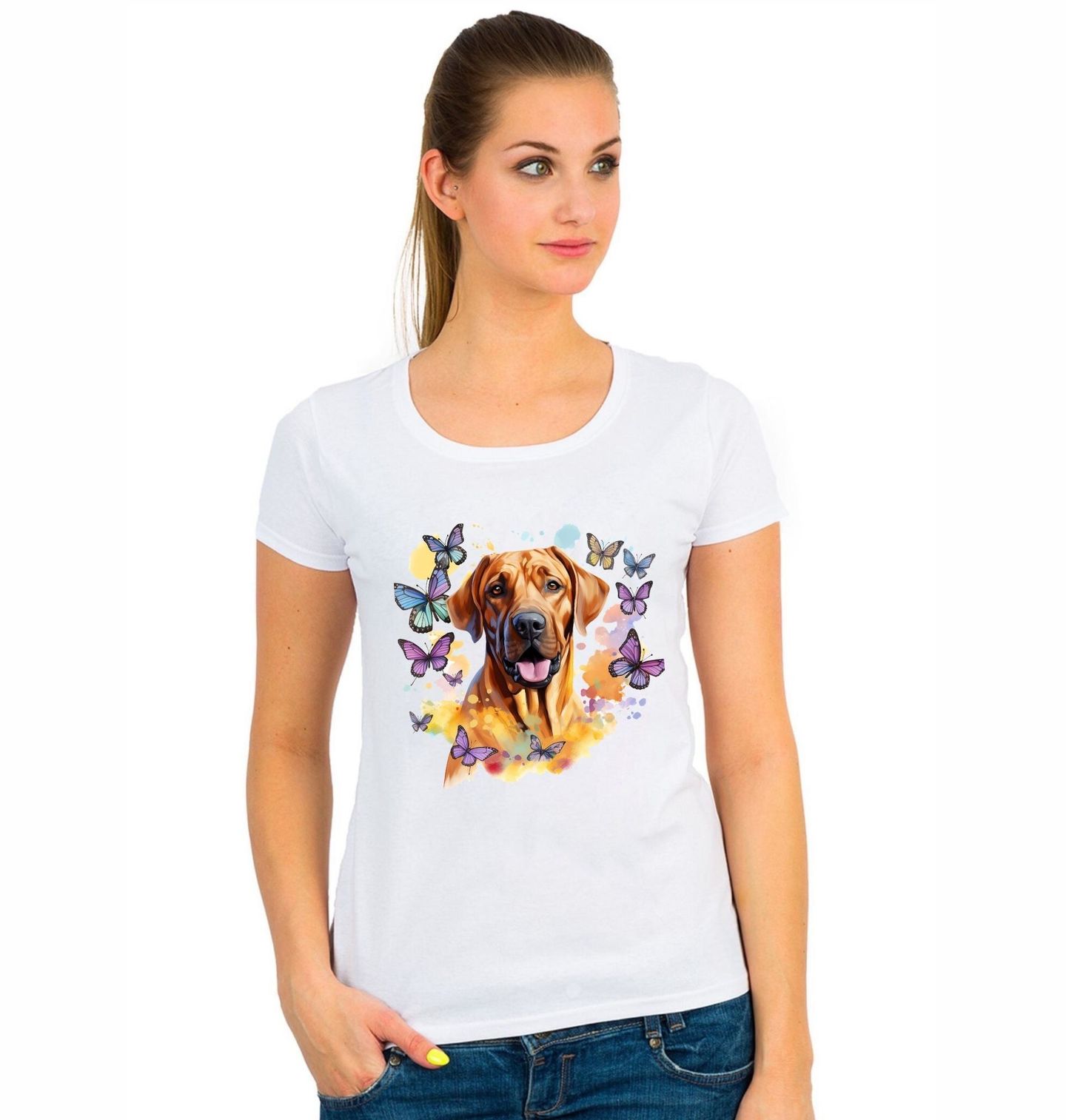 Dámské tričko Rhodéský ridgeback v Motýlí Zahradě. Krásný autorský motiv, na kterém je majestátní pes Rhodéský ridgeback obklopený jemně laděnými motýly na pozadí barevných akvarelových skvrn. Ideální volba pro každého pejskaře, který miluje spojení přírody, elegance a psí oddanosti.