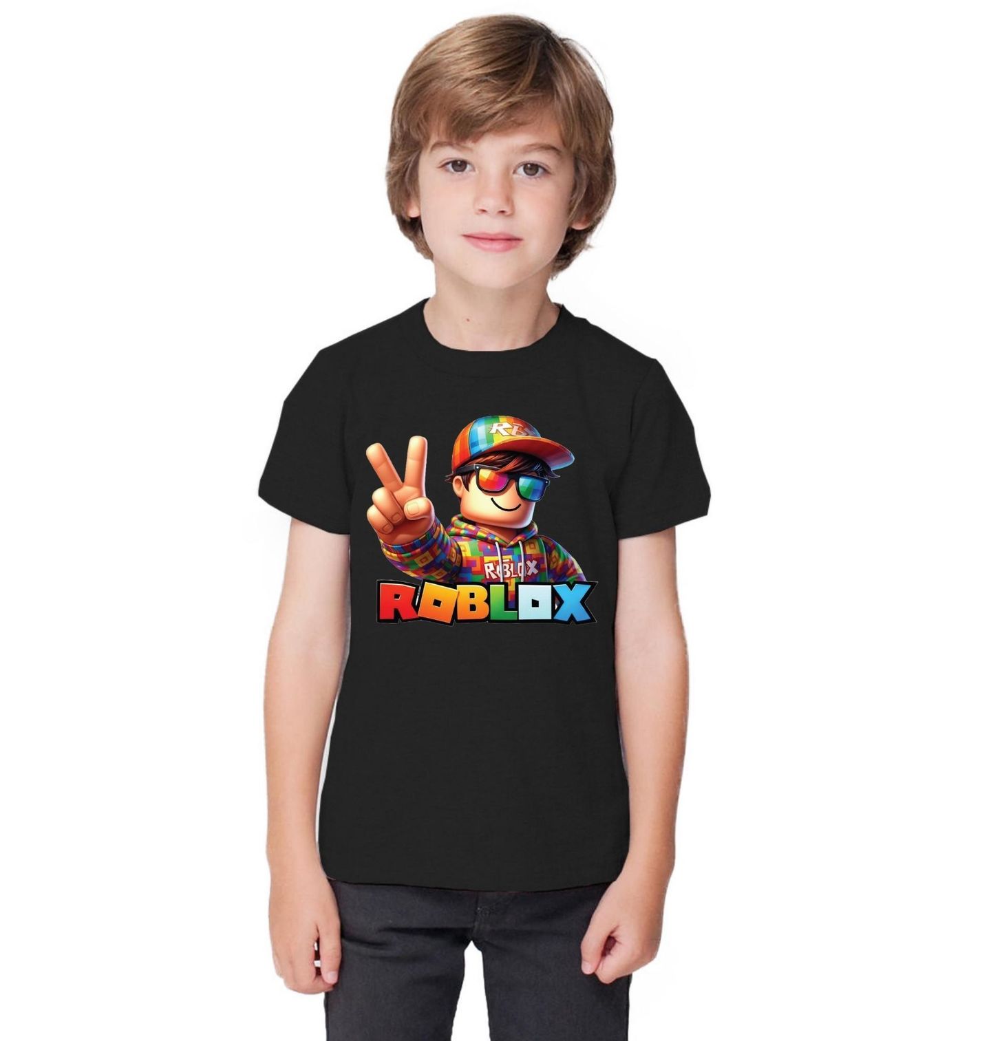Dětské tričko Roblox Avatar. Barevný motiv inspirovaný světem Roblox přináší moderní herní styl a pozitivní energii. Usměvavá postava s duhovými brýlemi a gestem vítězství dokonale vystihuje každého, kdo je nadšený gamer a odhodlaný hráč, který miluje kreativitu a nekonečné možnosti herního světa Roblox.