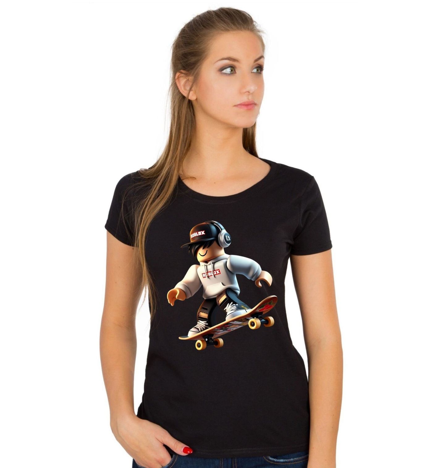 Dámské tričko Roblox Avatar na Skateboardu. Moderní motiv pro každého, kdo miluje roblox a životní styl pravý gamer. Tento design zachycuje cool postavu na skateboardu se sluchátky a kšiltovkou – ideální volba pro každý hráč, který chce ukázat svou vášeň pro hraní i street styl. Dynamický motiv spojuje energii skate kultury a svět roblox, což z něj dělá perfektní dárek pro fanouška herní komunity.