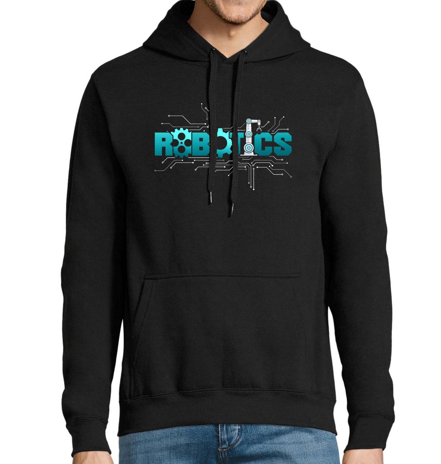 Pánská mikina Robotická Ruka ROBOTICS. Motiv plný energie a přesnosti! Slovo ROBOTICS je zde ztvárněno pomocí ozubených kol a robotické ruky, která tvoří písmeno „I“. To vše je propojeno digitálními obvody, které symbolizují propojení mezi robotem a inteligentní technologií.