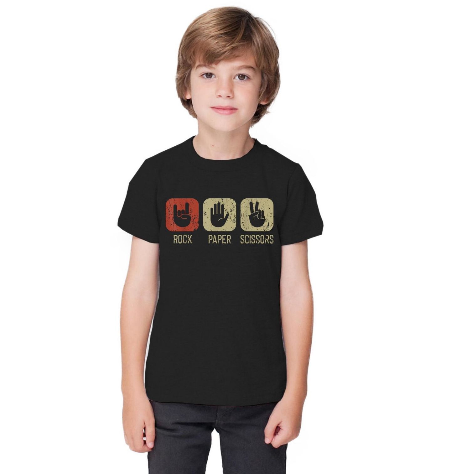 Dětské tričko Rock and Roll Paper Scissors. Originální motiv inspirovaný legendární hrou „Rock Paper Scissors“ (v překladu „Kámen, papír, nůžky“) v moderním vintage stylu. Design zobrazuje tři ikonická gesta ruky – rock, paper, scissors – v retro grafickém provedení s lehce patinovaným efektem. Nadčasový motiv, který nikdy nevyjde z módy – stejně jako rock and roll sám.