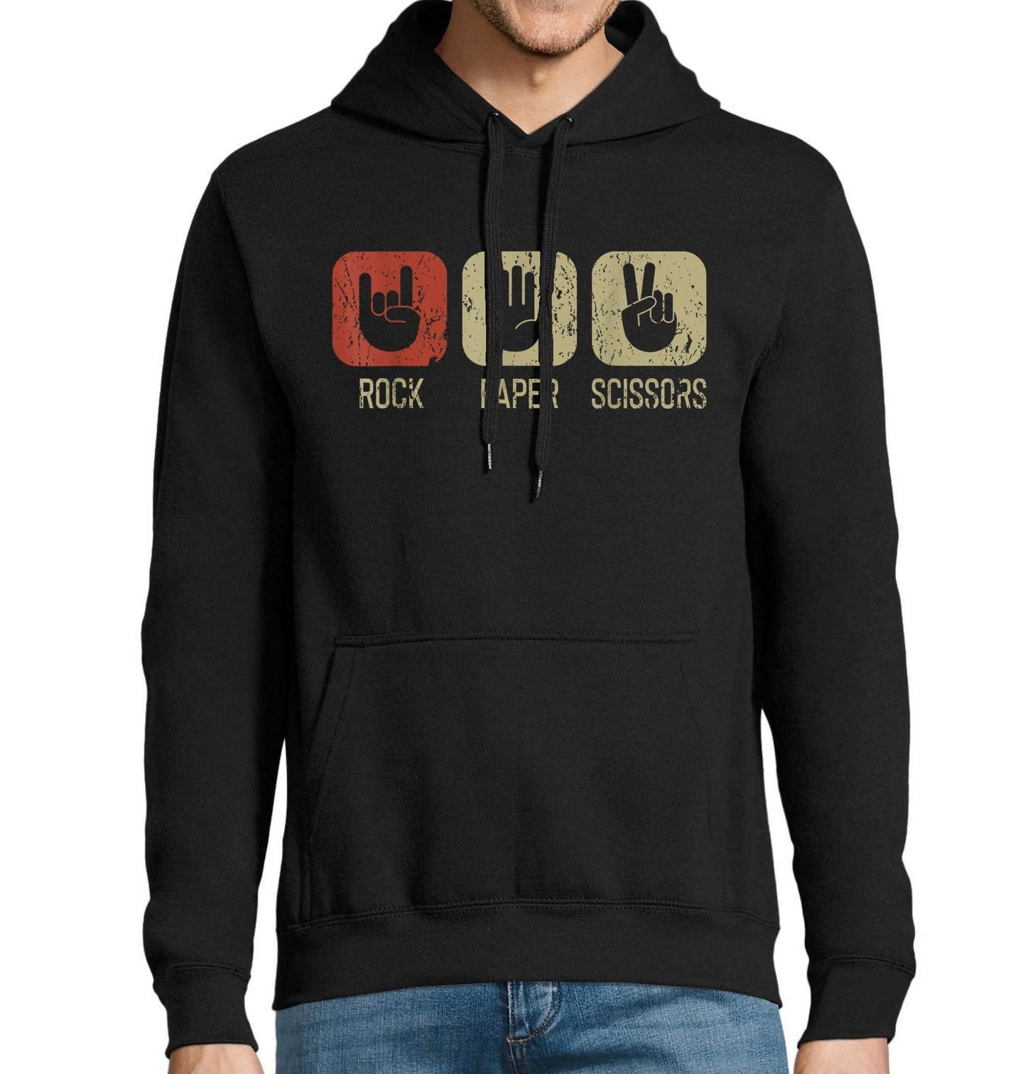 Pánská mikina Rock and Roll Paper Scissors. Originální motiv inspirovaný legendární hrou „Rock Paper Scissors“ (v překladu „Kámen, papír, nůžky“) v moderním vintage stylu. Design zobrazuje tři ikonická gesta ruky – rock, paper, scissors – v retro grafickém provedení s lehce patinovaným efektem. Nadčasový motiv, který nikdy nevyjde z módy – stejně jako rock and roll sám.