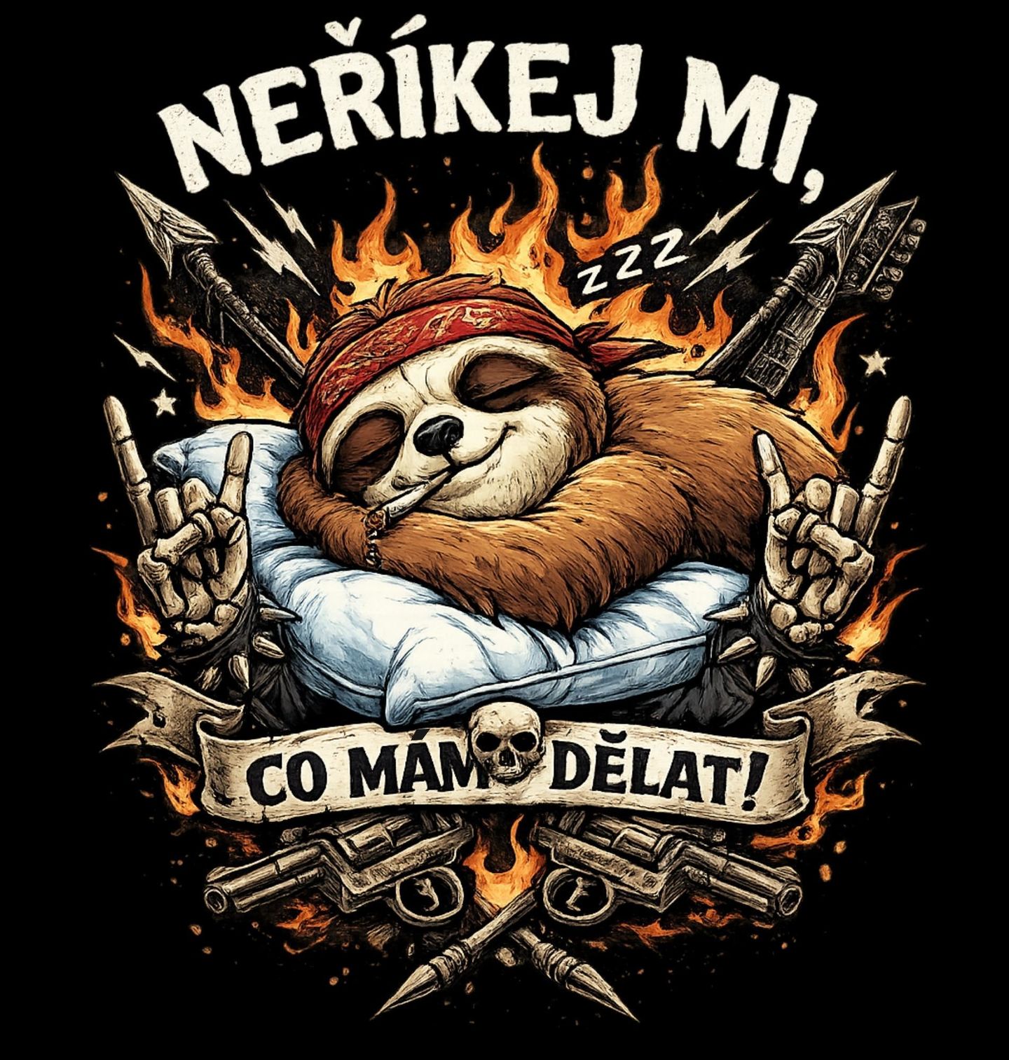 Dámské tričko Rocker Lenochod Neříkej mi, co mám dělat. Spící výraz, rocková gesta a divoké pozadí vytváří kombinaci humoru a stylu, kterou ocení každý fanoušek rock and roll i jointu. Design spojuje lenost, svobodu a lehkou provokaci, takže skvěle sedne na koncerty, festivaly nebo jako vtipný dárek pro kamaráda, který žije podle vlastních pravidel.