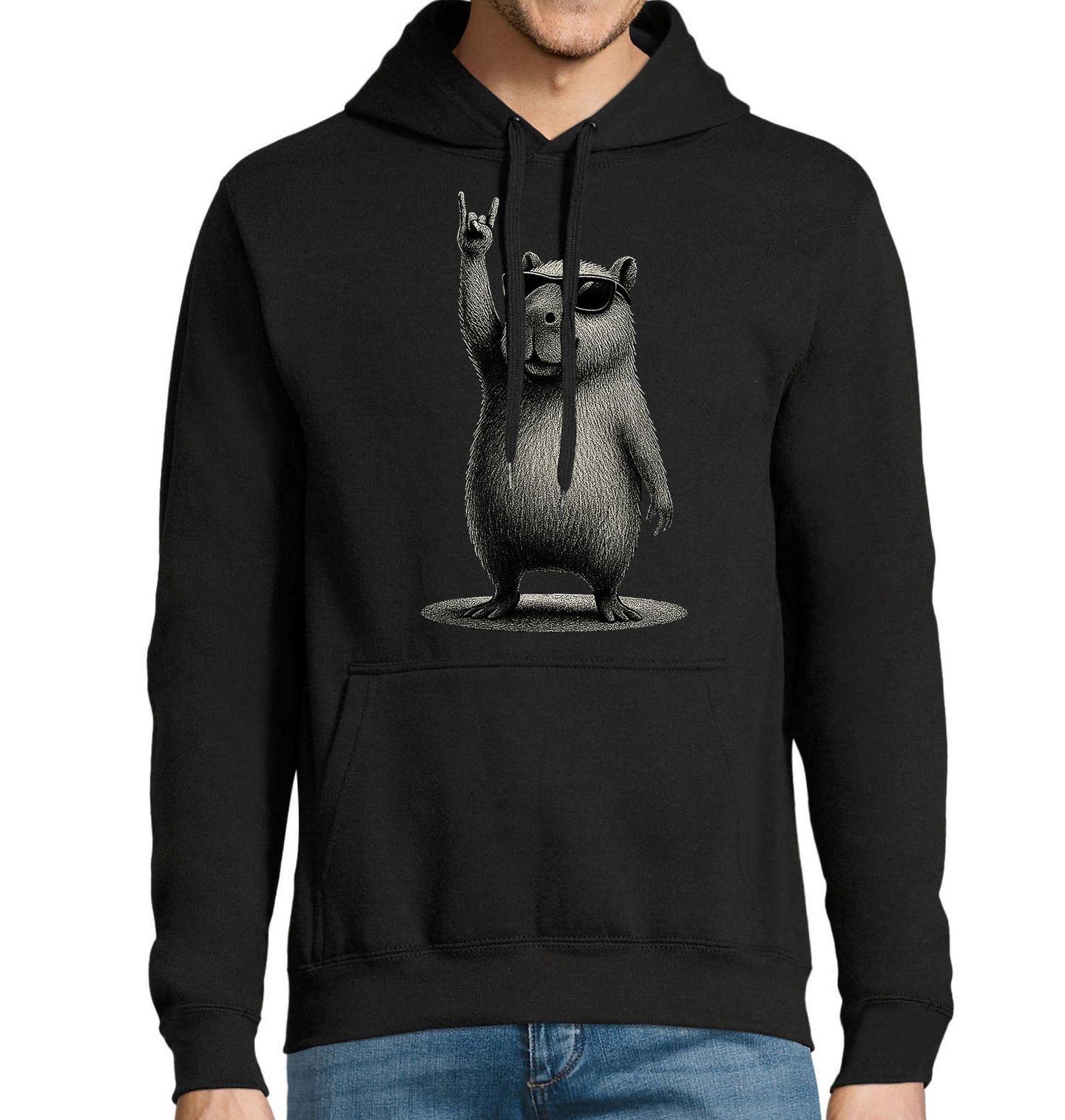 Pánská mikina Rocková Kapybara. Motiv s kapybarou v brýlích, která ukazuje rockové gesto a působí maximálně sebevědomě a vtipně. Design dodává outfitu šmrnc a je ideální pro všechny milovníky humoru i zvířat. Kapybara v této podobě zaujme na první pohled a perfektně vystihuje pohodový životní styl.