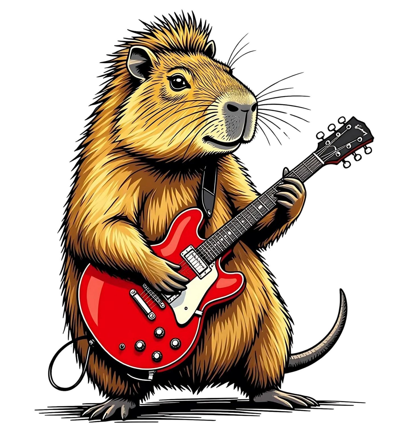 Dámské tričko Rocková Kapybara s Kytarou. Originální a zábavný motiv, který spojuje hudbu a zvířecí svět v jednom nezaměnitelném stylu. Kapybara jako charismatický hlodavec bere do tlapek elektrickou kytaru a mění se v rockovou hvězdu, která si jde vlastní cestou.