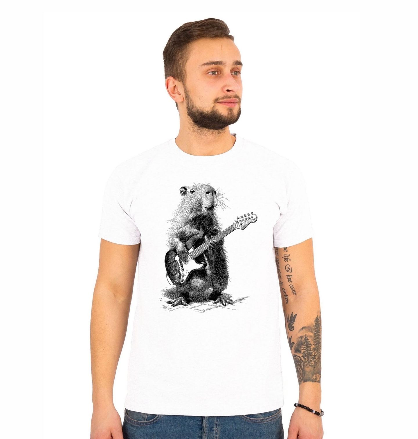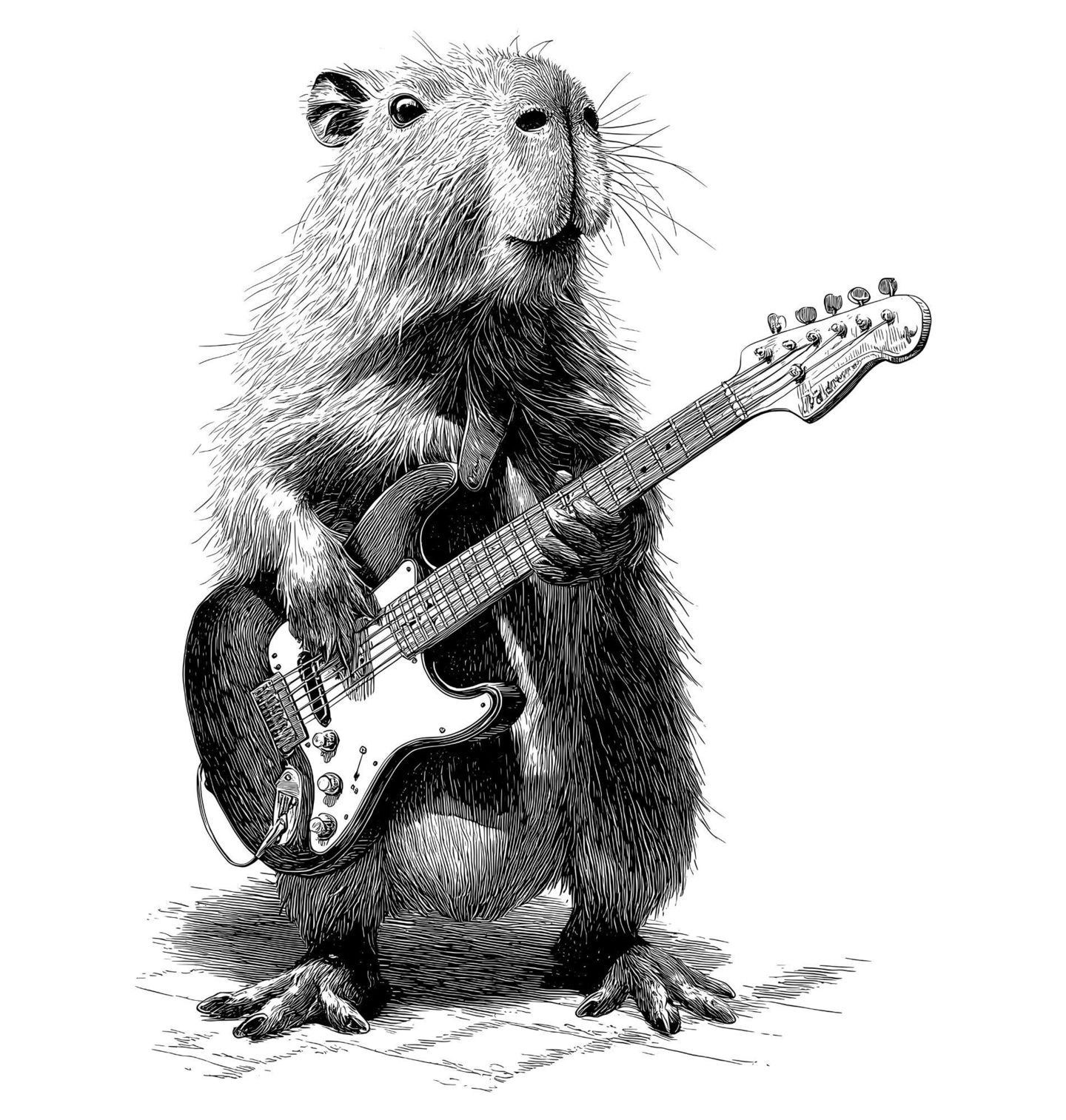 Pánské tričko Rocková Kapybara Skica. Originální a lehce bláznivý motiv, který spojuje svět hudby a zvířecího šarmu. Detailně zpracovaná kapybara, největší hlodavec na světě, drží elektrickou kytaru a působí jako skutečná hvězda pódia. Tenhle design jasně říká jediné – rock and roll nemá hranice. Precizní ilustrace v černobílém stylu dodává motivu umělecký nádech, zatímco postoj zvířete s kytarou přináší nadsázku.
