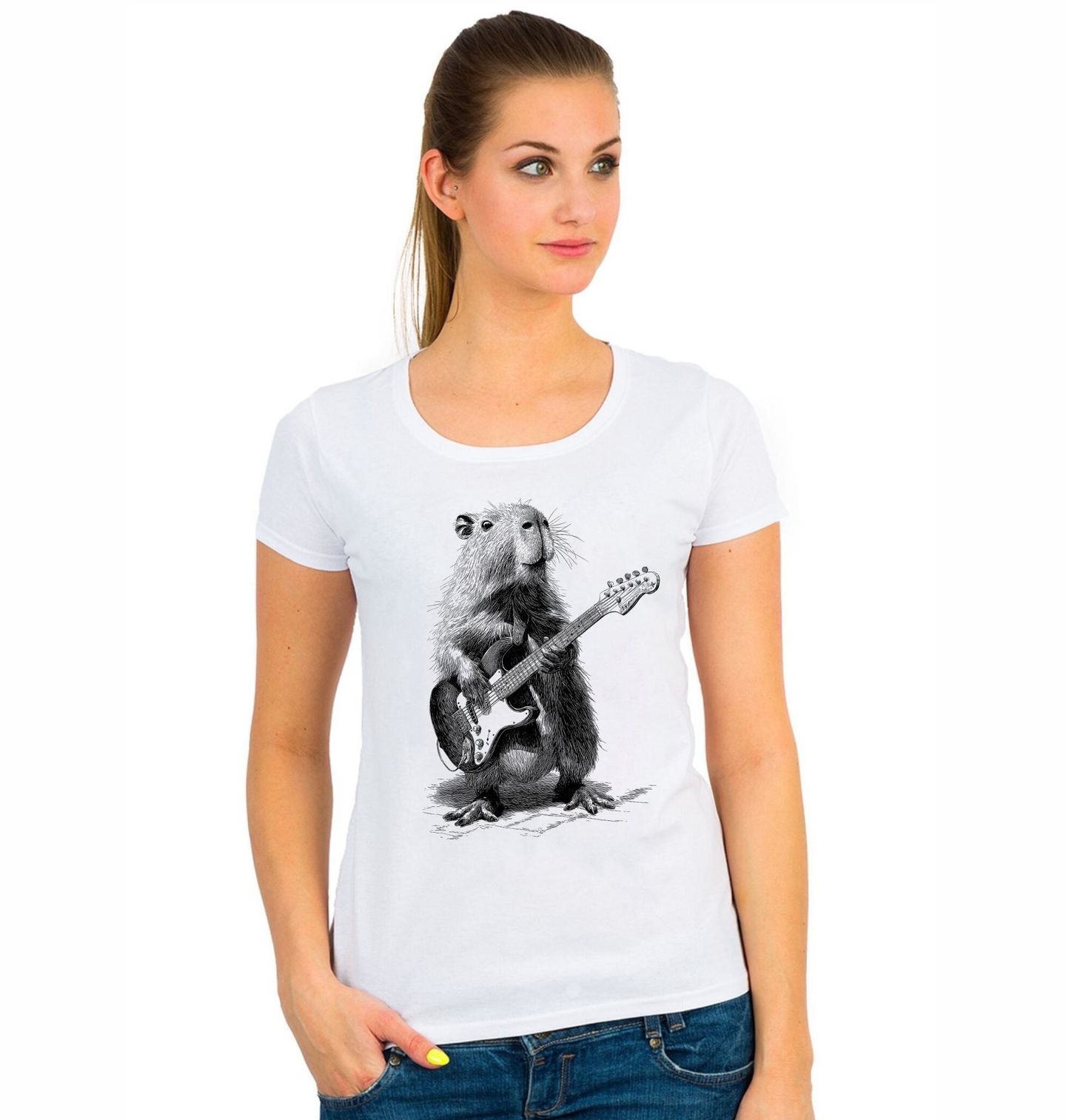 Dámské tričko Rocková Kapybara Skica. Originální a lehce bláznivý motiv, který spojuje svět hudby a zvířecího šarmu. Detailně zpracovaná kapybara, největší hlodavec na světě, drží elektrickou kytaru a působí jako skutečná hvězda pódia. Tenhle design jasně říká jediné – rock and roll nemá hranice. Precizní ilustrace v černobílém stylu dodává motivu umělecký nádech, zatímco postoj zvířete s kytarou přináší nadsázku.