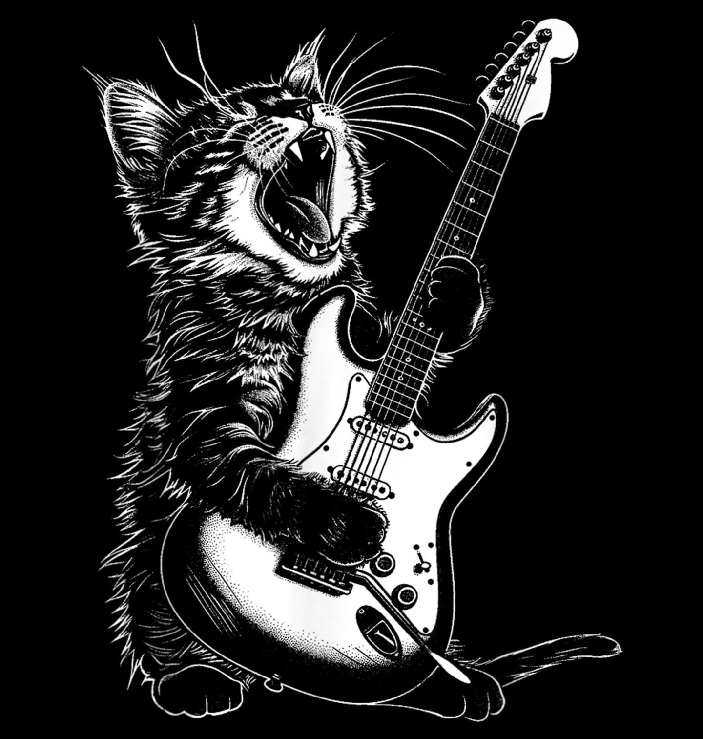 Pánská mikina Rocková Kočka s Kytarou. Originální motiv zachycuje divokou kočka ve chvíli naprostého hudebního nadšení. S otevřenou tlamou, vyceněnými zuby a elektrickou kytarou v tlapkách předvádí nefalšovaný rock and roll výkon. Černobílé provedení dodává designu syrový, koncertní náboj a podtrhuje energii okamžiku, jako byste stáli přímo pod pódiem.