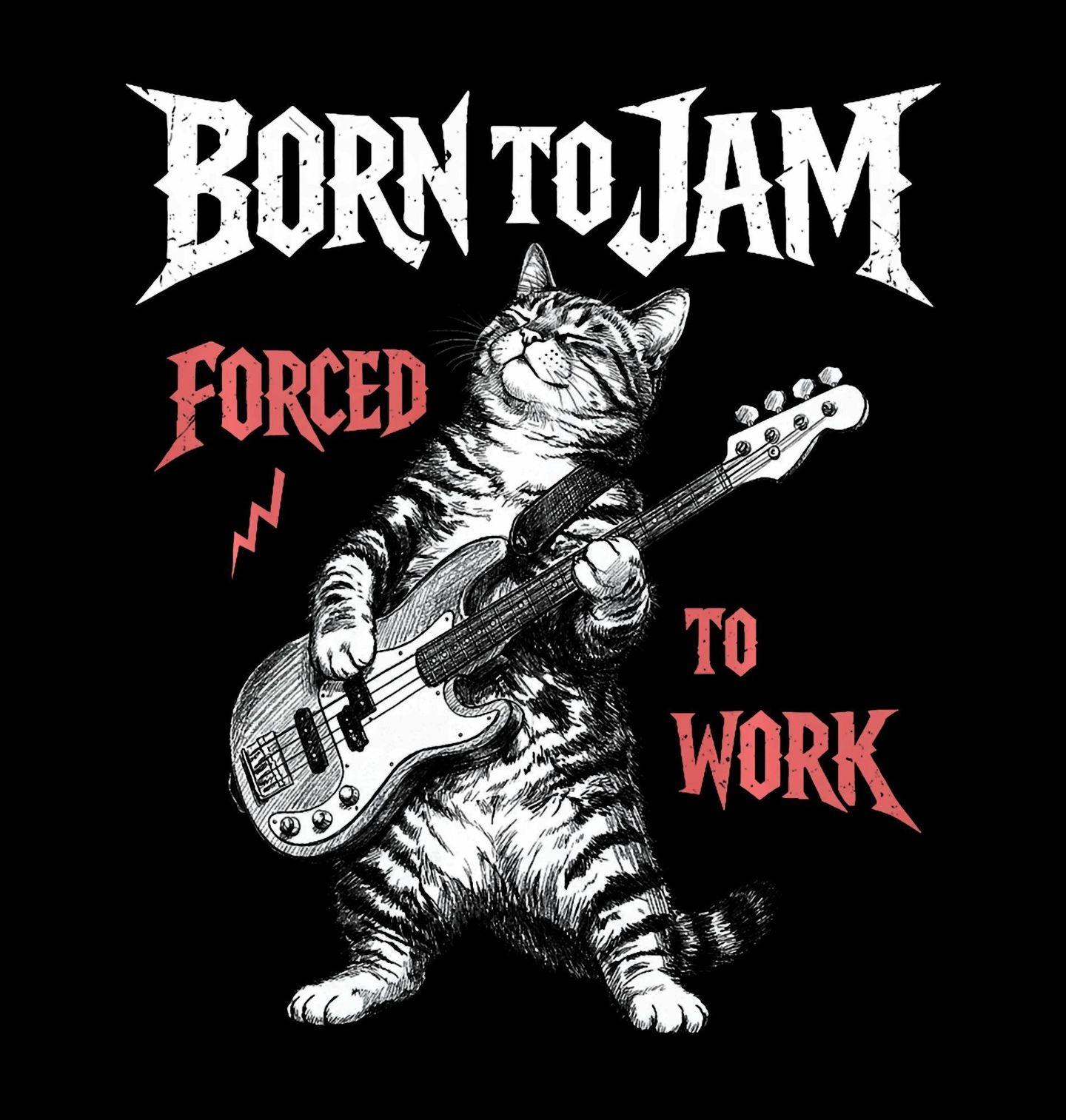 Dámské tričko Rocková Kočka s Kytarou Born to Jam. Tato kočka s kytarou žije pro hudbu a energii rocku. Text „BORN TO JAM, FORCED TO WORK“ znamená „Zrozený pro jamování, donucený pracovat“, což pobaví každého, kdo by raději hrál než pracoval. Ideální motiv pro hudební nadšence.