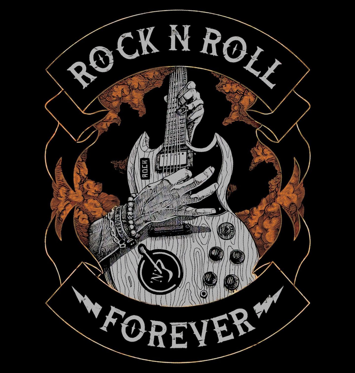 Dámské tričko Rocková Kytara Navždy. Legendární motiv pro všechny, jejichž srdce bije v rytmu rocku! Detailní ilustrace ruky držící elektrickou kytaru, obklopená zlatými plameny a stuhami s nápisy "ROCK N ROLL" a "FOREVER" (v překladu: "Rock'n'Roll navždy"), dává jasně najevo, že tenhle styl nikdy neumírá.