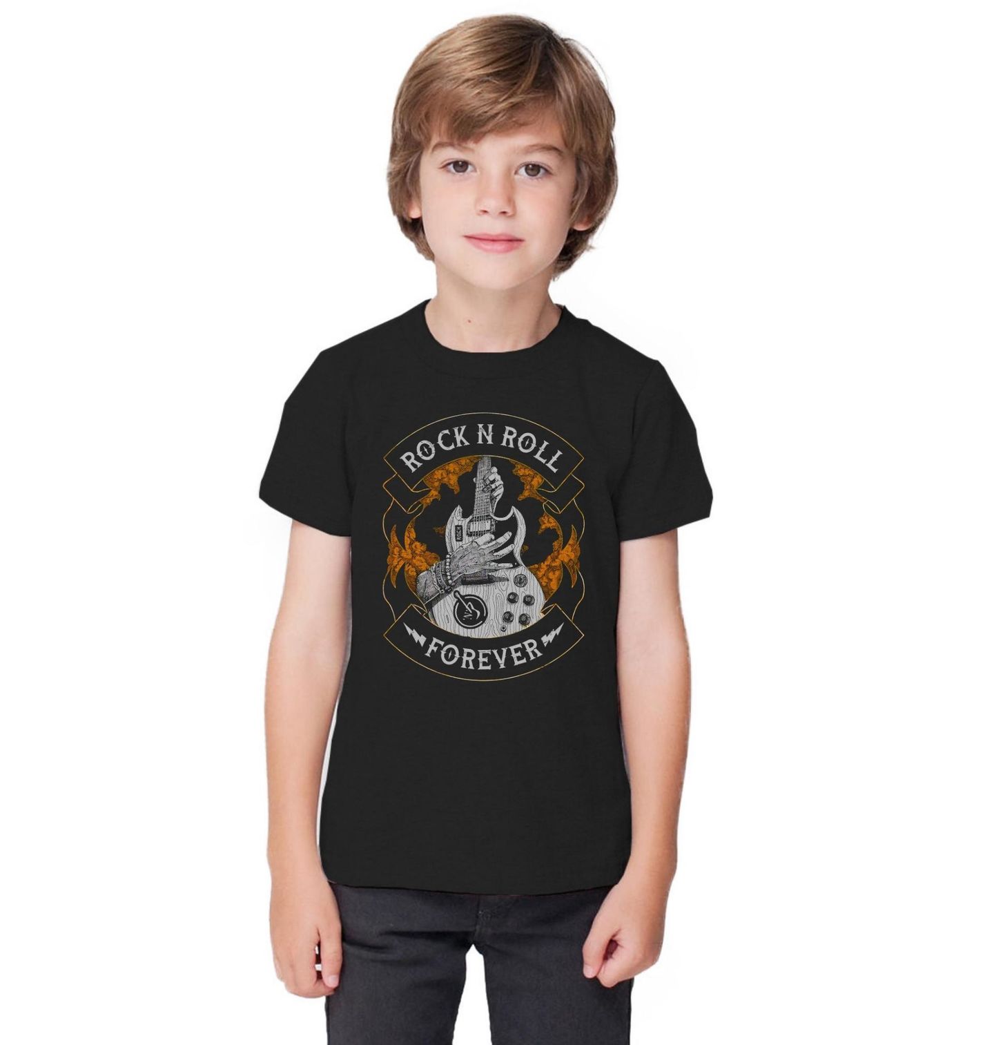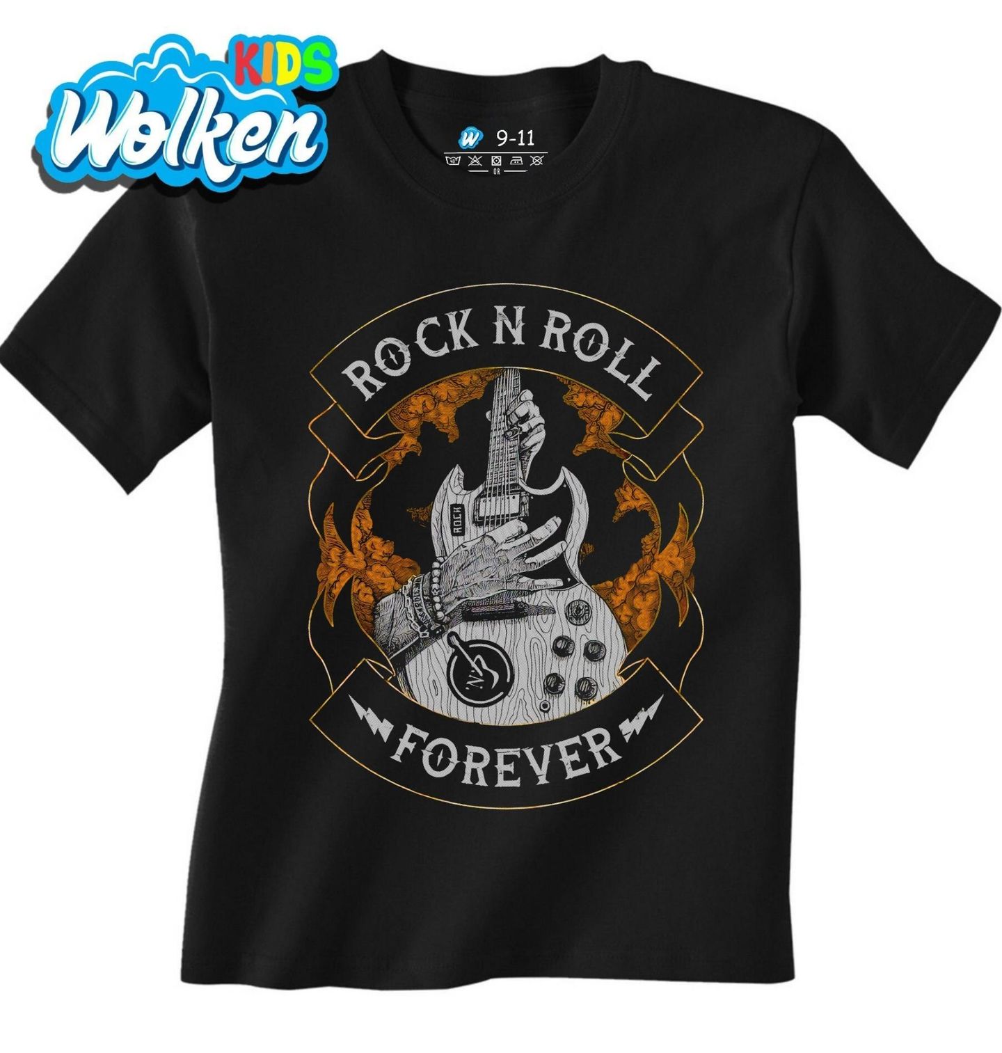 Dětské tričko Rocková Kytara Navždy. Legendární motiv pro všechny, jejichž srdce bije v rytmu rocku! Detailní ilustrace ruky držící elektrickou kytaru, obklopená zlatými plameny a stuhami s nápisy "ROCK N ROLL" a "FOREVER" (v překladu: "Rock'n'Roll navždy"), dává jasně najevo, že tenhle styl nikdy neumírá.