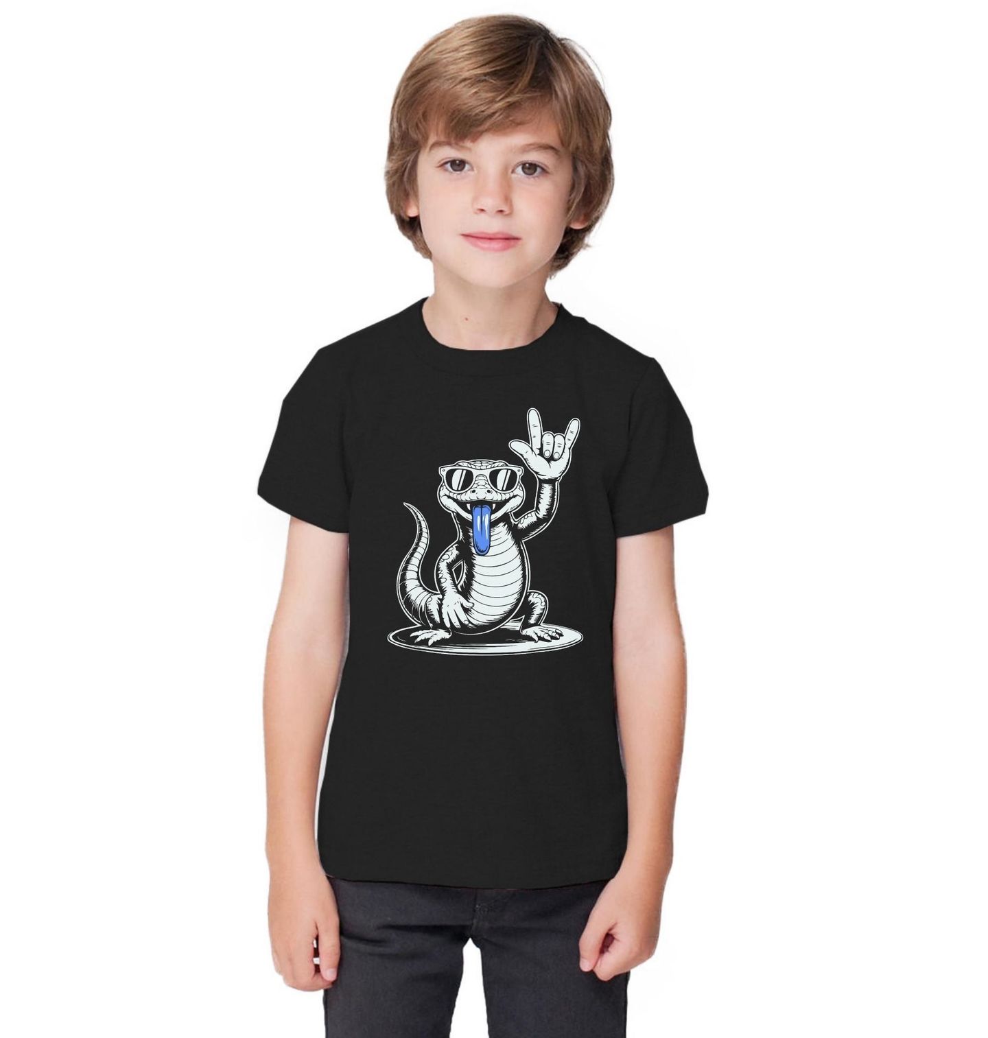 Dětské tričko Rocková Tilikva australská Blue-tongued skink. Motiv inspirovaný ještěrem Tilikva (Blue-tongued skinks), který je známý svým typickým modrým jazykem. Tento cool lizard má sluneční brýle, vyplazuje modrý jazyk a ukazuje rockové gesto rukou — prostě absolutní legenda mezi plazy! Motiv je kreslený v moderním komiksovém stylu a skvěle se hodí pro milovníky plazů a rocku.