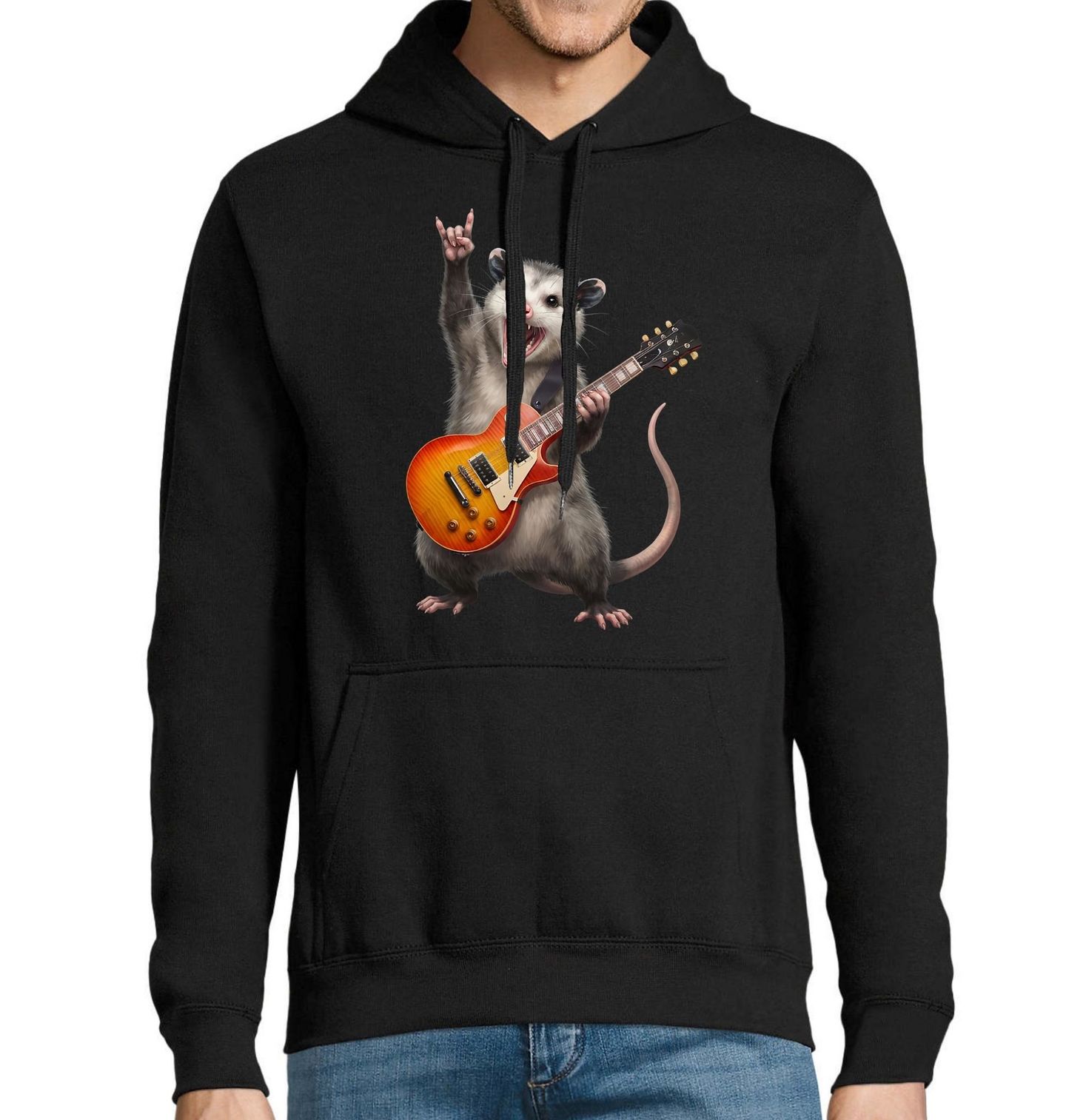 Pánská mikina Rocková Vačice s Kytarou. Zábavný design zobrazuje vačici hrající na elektrickou kytaru a ukazující rockové gesto. Tento energický motiv designu osloví milovníky hudby, humoru a netradičních zvířecích ilustrací.
