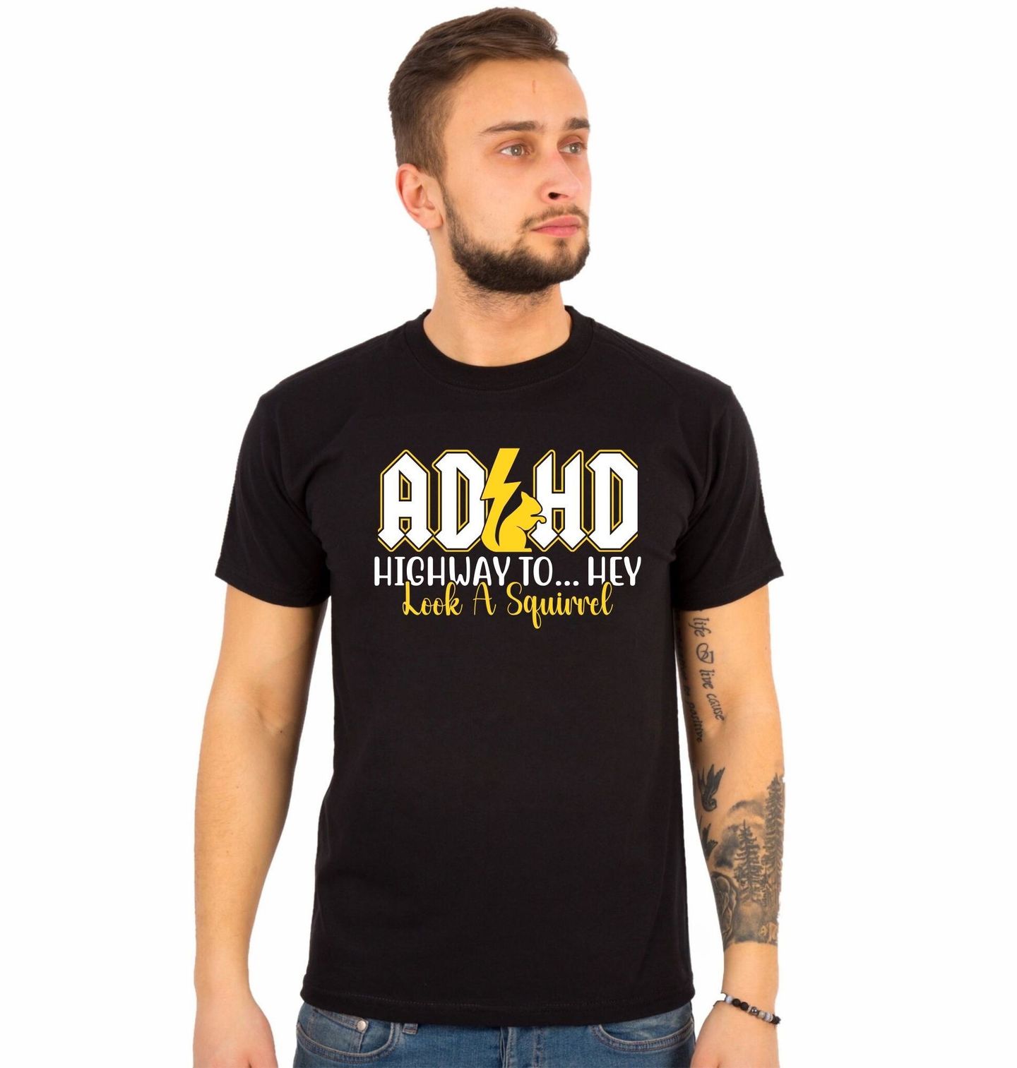 Pánské tričko Rocková Veverka ACDC. ADHD – highway to hey, look... squirrel! česky ADHD – Dálnice do... hele, koukej, veverka! Parodie na slavné logo kapely AC/DC a jejich hit Highway to Hell. Přesně tak vypadá den s ADHD – plný energie, chaosu a nečekaných změn směru.