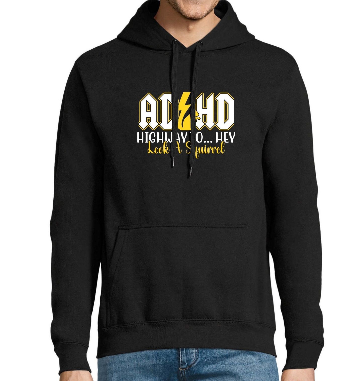Pánská mikina Rocková Veverka ACDC. ADHD – highway to hey, look... squirrel! česky ADHD – Dálnice do... hele, koukej, veverka! Parodie na slavné logo kapely AC/DC a jejich hit Highway to Hell. Přesně tak vypadá den s ADHD – plný energie, chaosu a nečekaných změn směru.