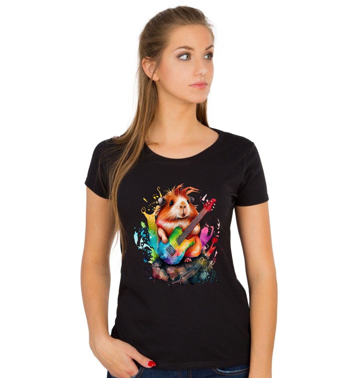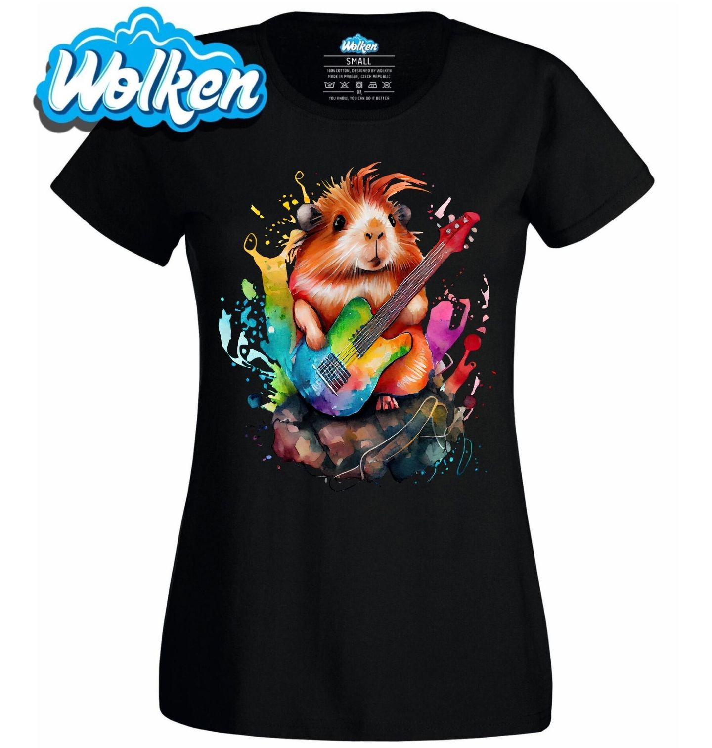 Dámské tričko Rockové Morče s Kytarou. Připravte se na pořádný koncert! Hlodavec jako rocková hvězda s barevnou elektrickou kytarou v tlapkách. Stylový akvarelový design plný energie, barev a muzikantského ducha je ideální pro všechny milovníky hudby, zvířat a originality.