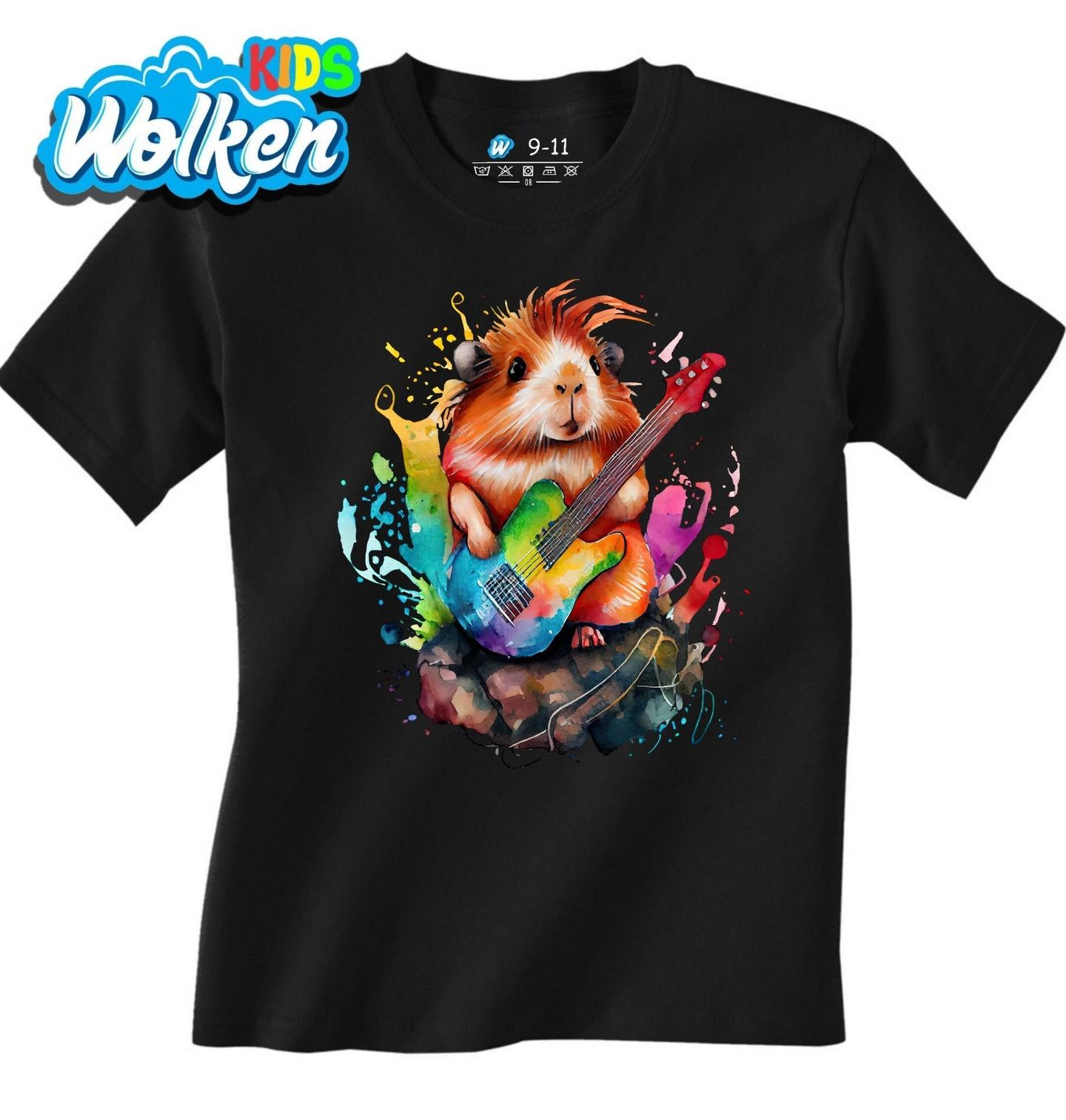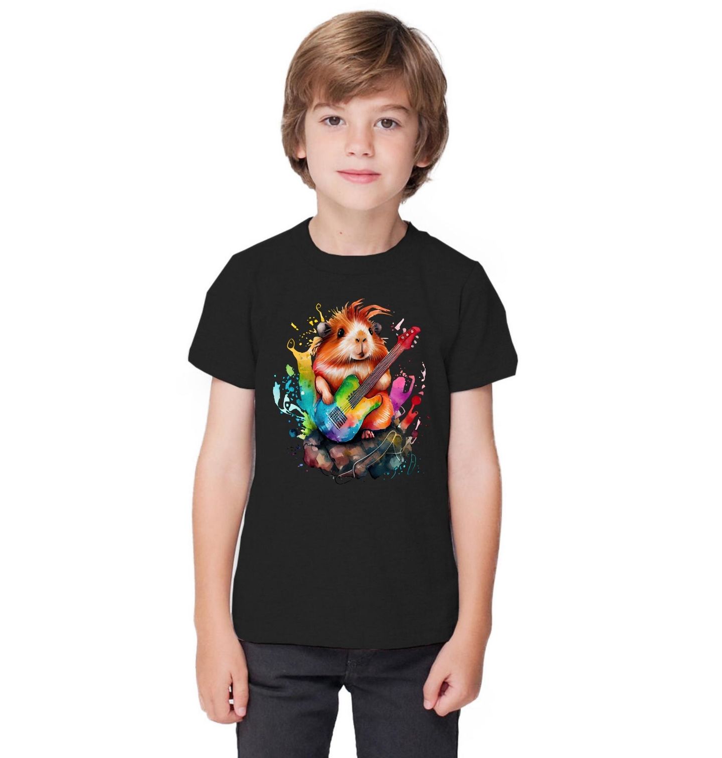 Dětské tričko Rockové Morče s Kytarou. Připravte se na pořádný koncert! Hlodavec jako rocková hvězda s barevnou elektrickou kytarou v tlapkách. Stylový akvarelový design plný energie, barev a muzikantského ducha je ideální pro všechny milovníky hudby, zvířat a originality.