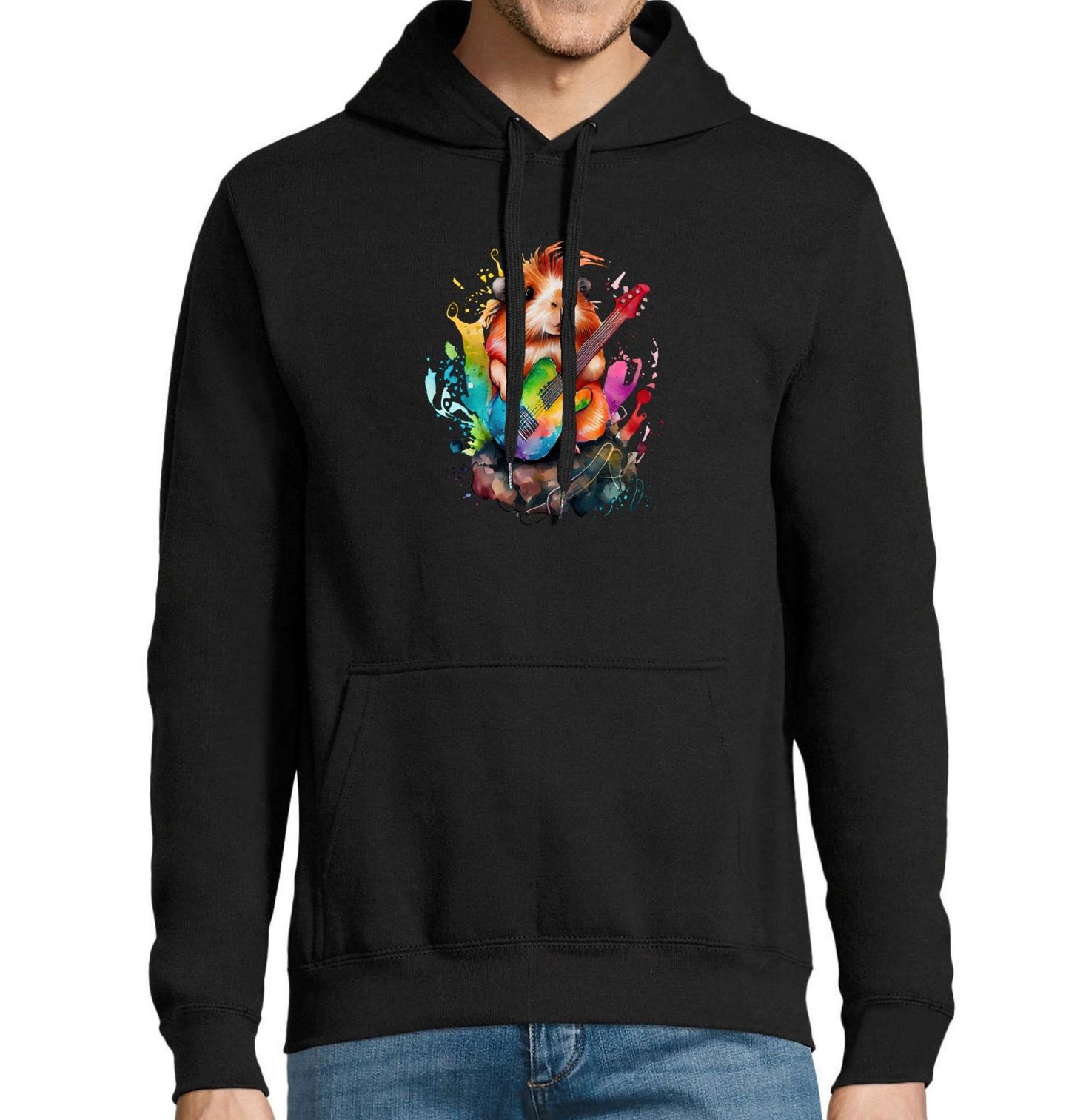 Pánská mikina Rockové Morče s Kytarou. Připravte se na pořádný koncert! Hlodavec jako rocková hvězda s barevnou elektrickou kytarou v tlapkách. Stylový akvarelový design plný energie, barev a muzikantského ducha je ideální pro všechny milovníky hudby, zvířat a originality.