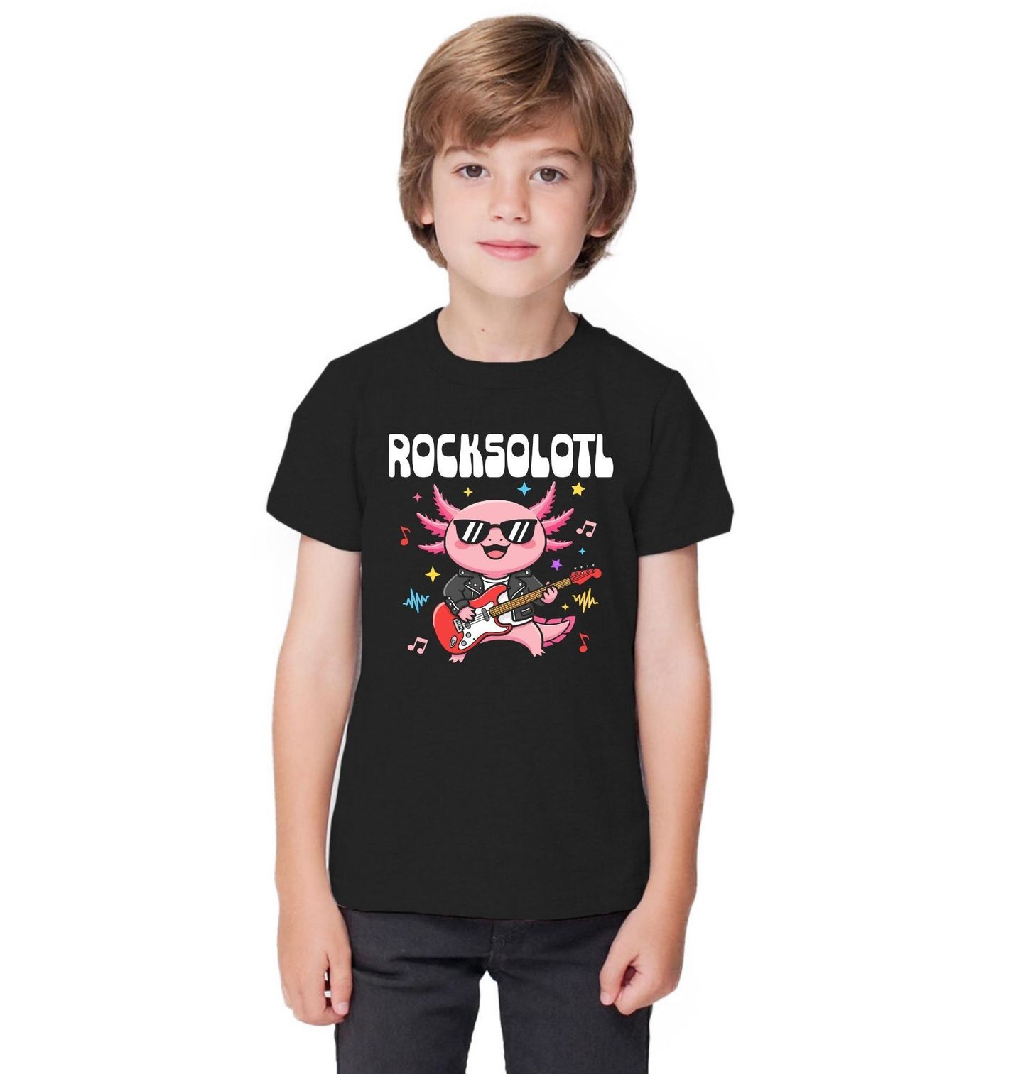 Dětské tričko Rockový Axolotl Rocksolotl. Tenhle hravý a barevný motiv si zamiluje každý, kdo má rád zvířata, rock a pořádnou dávku nadsázky. Roztomilý axolotl v kožené bundě si užívá koncert, v rukou drží elektrickou kytaru a všude kolem létají hudební noty. Hudba je radost, energie a svoboda – a přesně to tenhle veselý design vyzařuje.