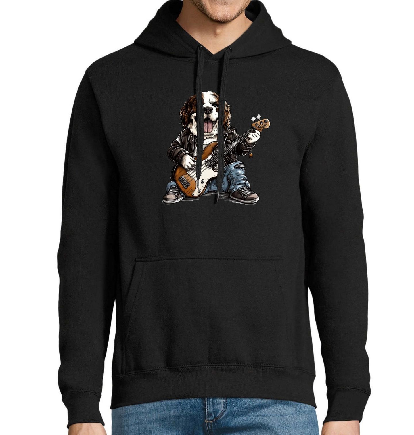 Pánská mikina Rockový Bernardýn s Kytarou. Motiv zobrazuje veselého bernardýna v kožené bundě, jak s chutí hraje na elektrickou baskytaru. Dokonalá kombinace rock and rollu a psí věrnosti – pro všechny, kdo chtějí nosit triko, které má charakter. Ideální volba pro každého pejskaře, který miluje hudbu, kytaru a styl, co má dráp i srdce.