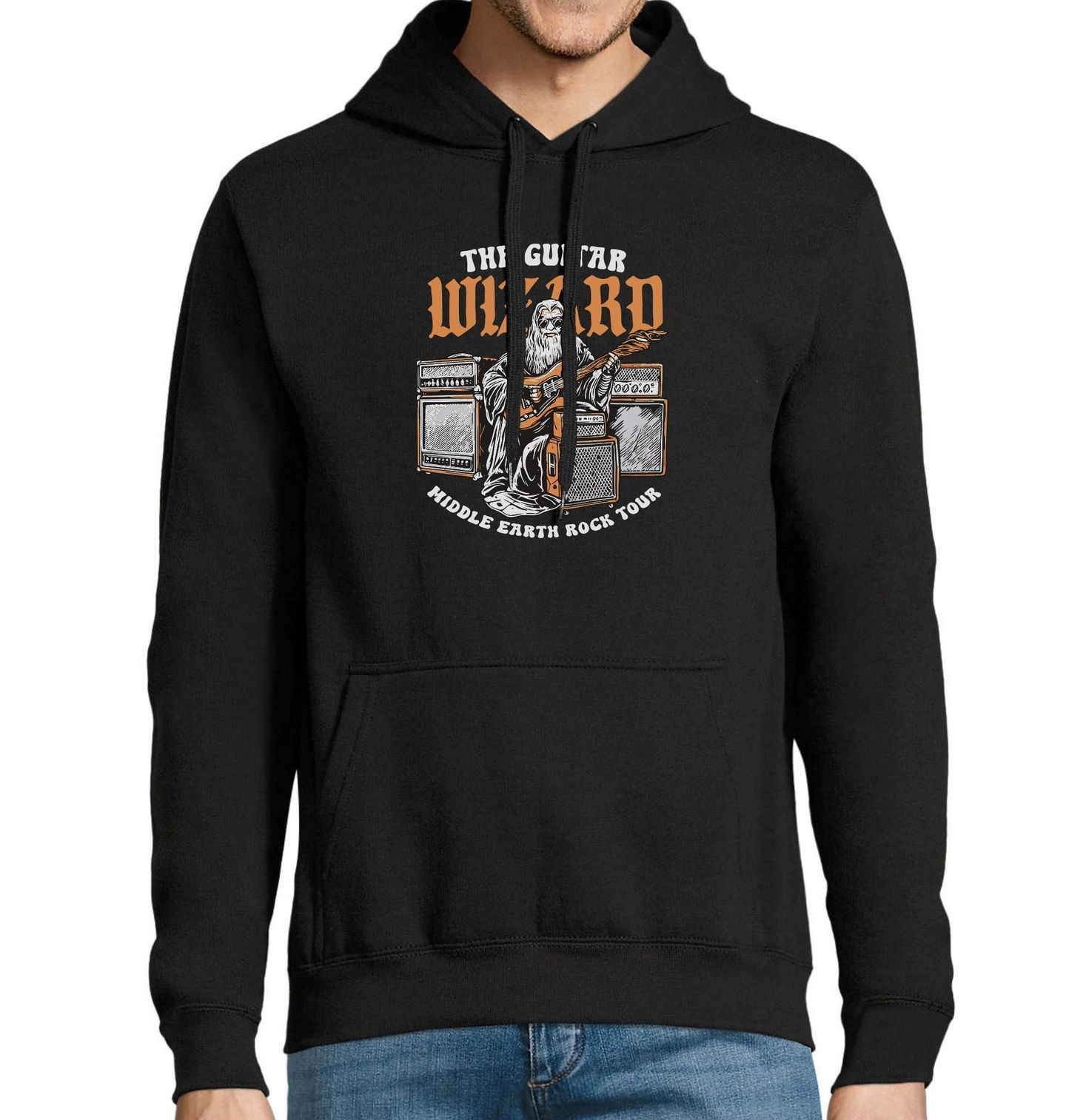 Pánská mikina Rockový Čaroděj Gandalf The Guitar Wizard. Čaroděj ze Středozemě odložil plášť i knihu kouzel a chopil se elektrické kytary, aby rozjel „Middle Earth Rock Tour“. Dokonalý merch pro fanoušky metalu, Pána prstenů a meme humoru. Zapomeň na klidnou hudbu elfů – přichází kytara, rock a pořádná porce magie!
