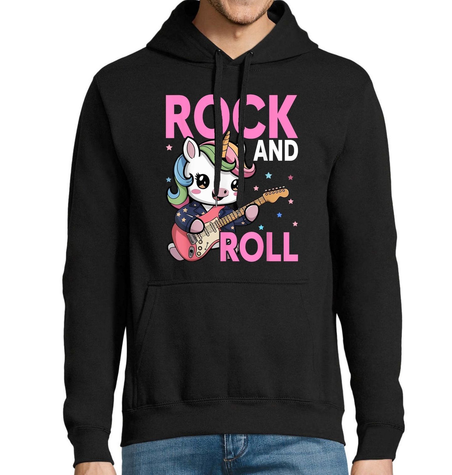 Pánská mikina Rockový Jednorožec. Roztomilý a hravý motiv spojuje kouzelný svět fantasy a energii Rock and Roll do jednoho originálního designu. Hlavní postavou je veselý jednorožec s duhovou hřívou, který hraje na elektrickou kytaru a rozdává radost i hudební nadšení. Rock and Roll zde dostává hravý a pohádkový nádech – jednorožec symbolizuje jedinečnost, odvahu a radost ze života.