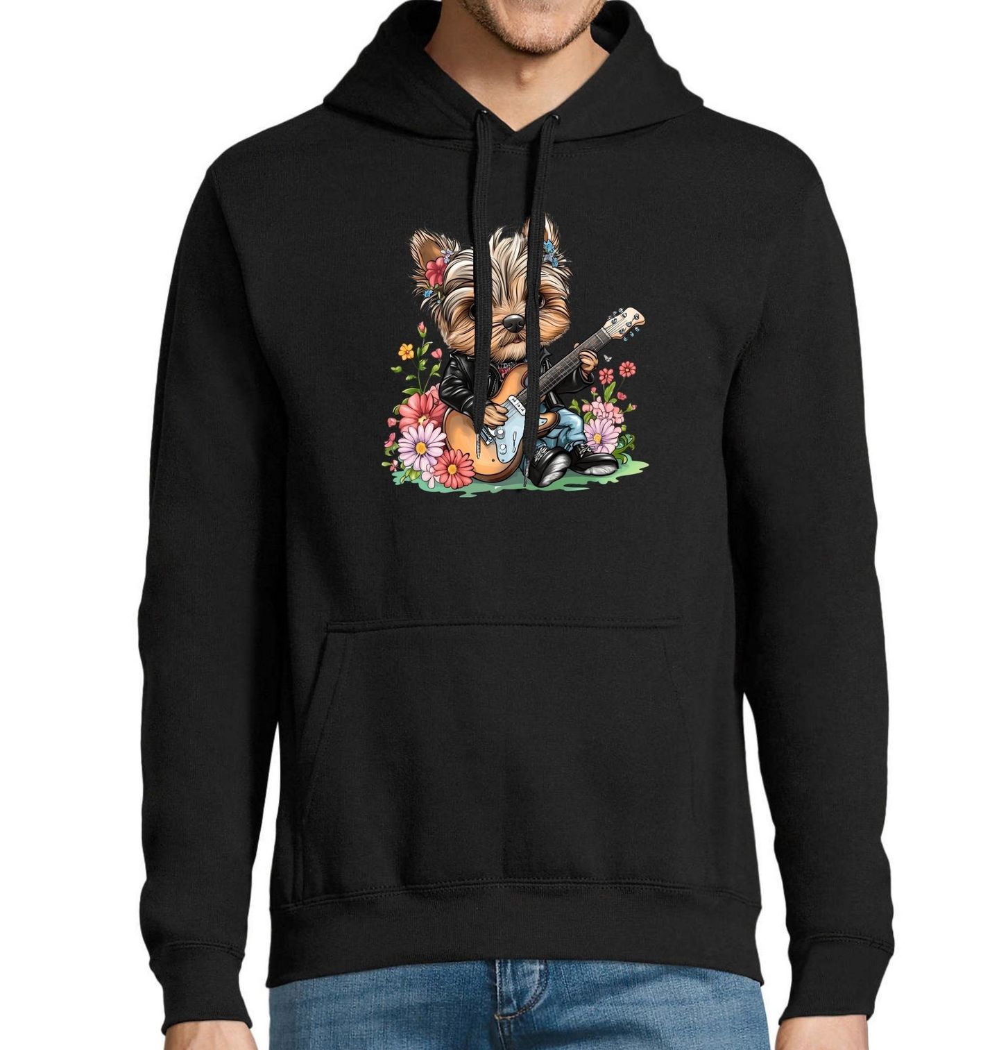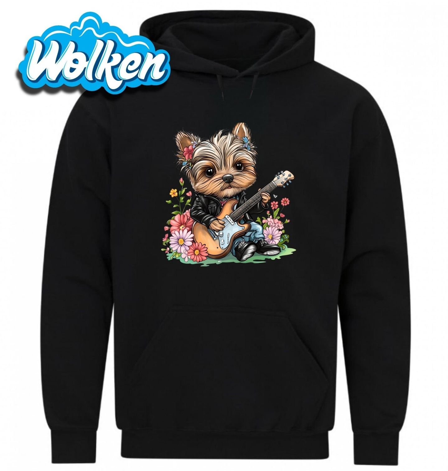 Pánská mikina Rockový Jorkšír s Kytarou. Hlavním hrdinou je Jorkšírský teriér jako stylový pes s elektrickou kytarou, obklopený květinami a oblečený do kožené bundy. Ideální volba pro každého pejskaře, který miluje hudbu, barvy a výjimečný design. Originální potisk zaručeně zaujme nejen fanoušky rocku, ale i milovníky Jorkšírů.