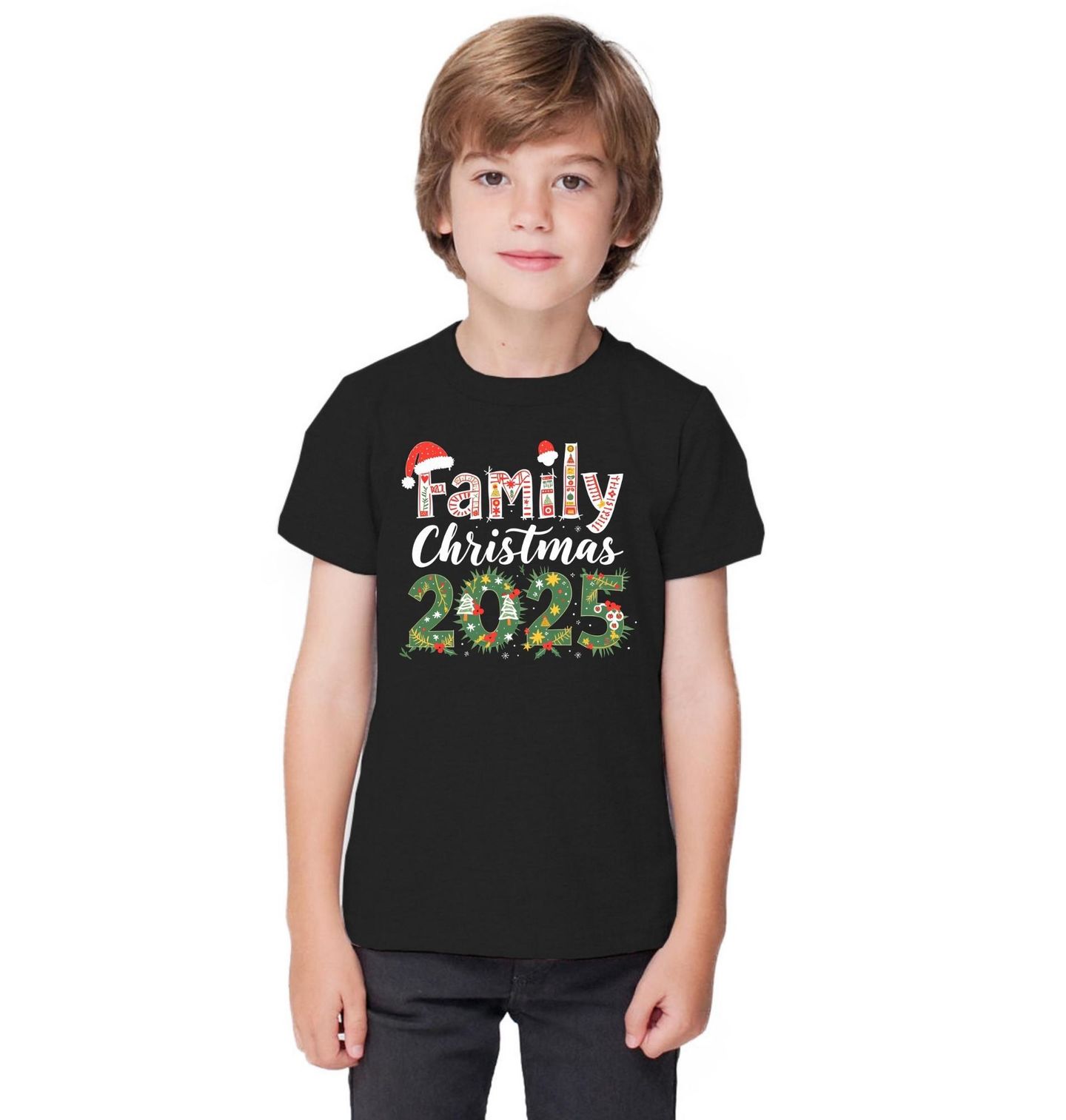 Dětské tričko Rodinné Vánoce Family Christmas 2025. Stylový motiv je ideální pro každého, kdo miluje Vánoce a rodina je pro něj na prvním místě. Barevné a detailně zpracované písmo doplněné o vánoční prvky jako stromečky, sněhové vločky, větvičky nebo čepice Santa Clause vytváří dokonalou sváteční atmosféru.