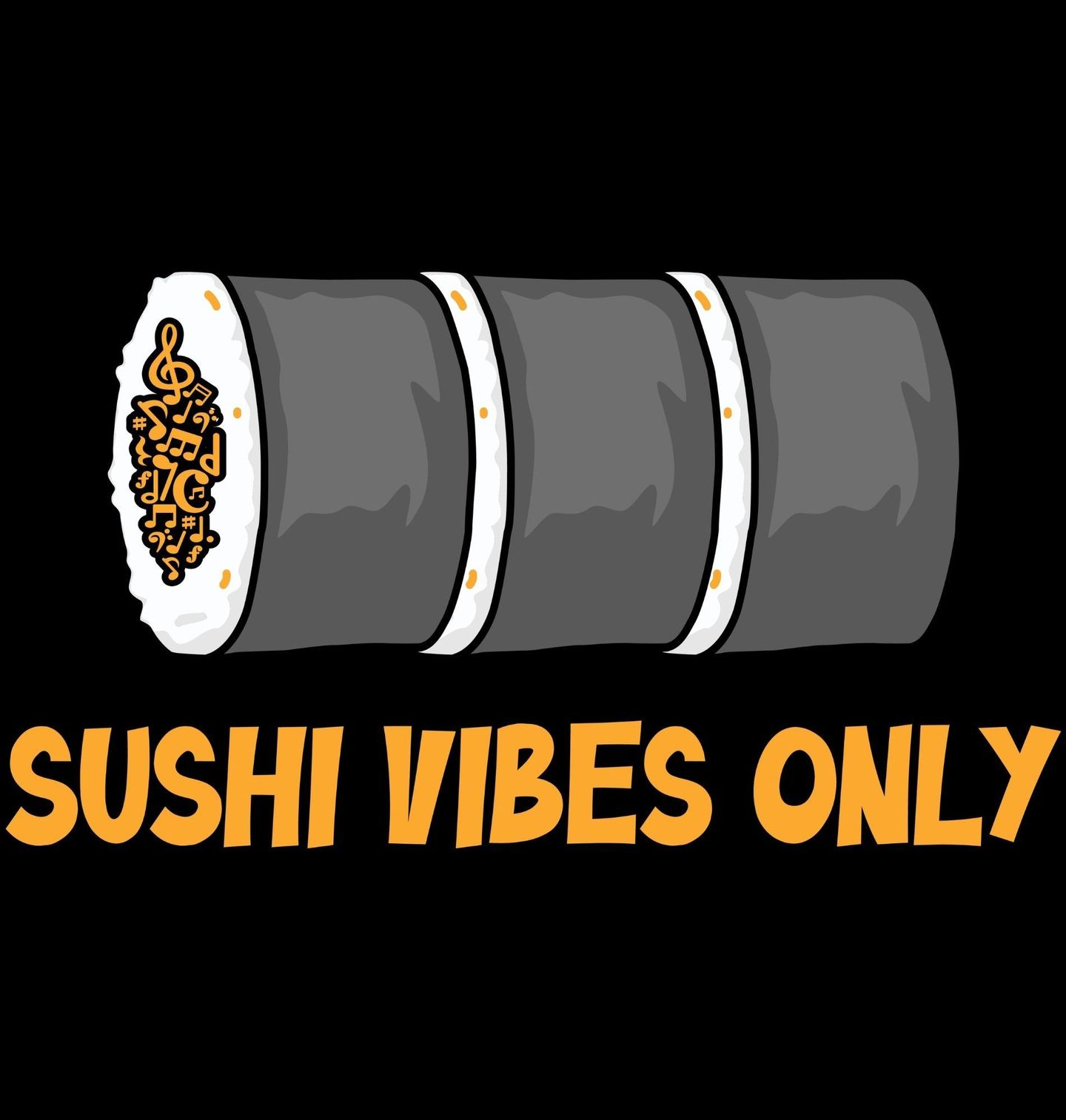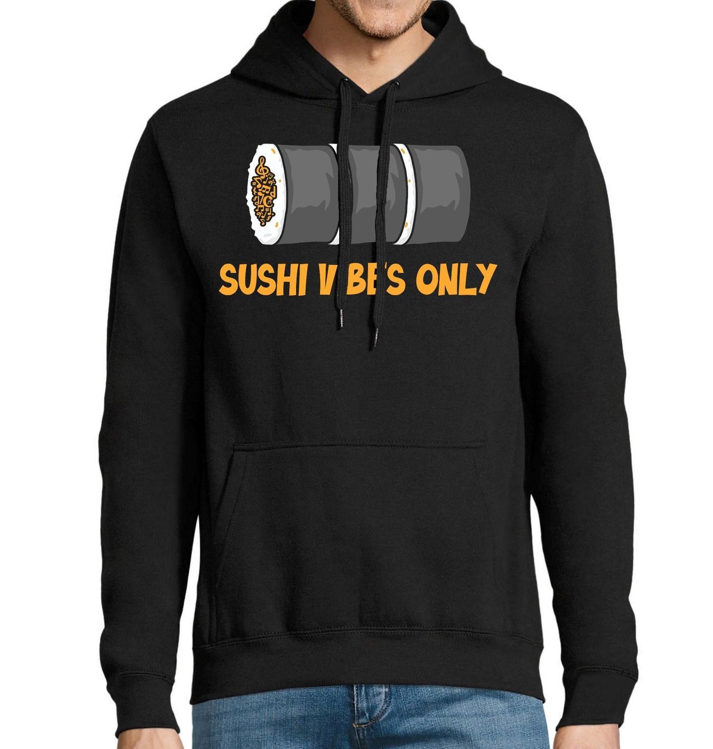 Pánská mikina Rolka Sushi Sushi Vibes Only. Stylový motiv sushi rolky s nápisem „Sushi vibes only“ znamená „Pouze sushi nálada“. Design je ideální pro milovníky japonské kuchyně a zejména sushi. Moderní grafika hudebních not uvnitř rolky dodává obrázku hravý a trendy vzhled.