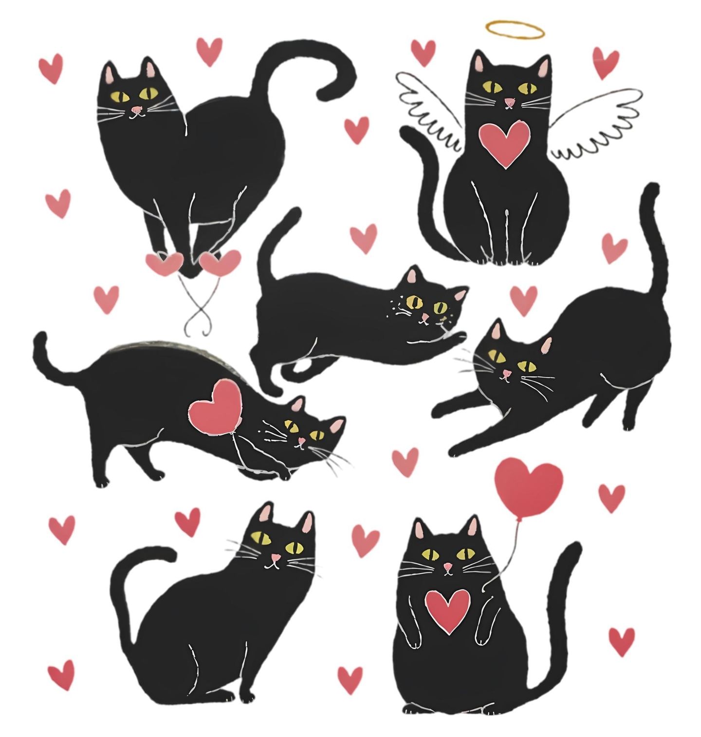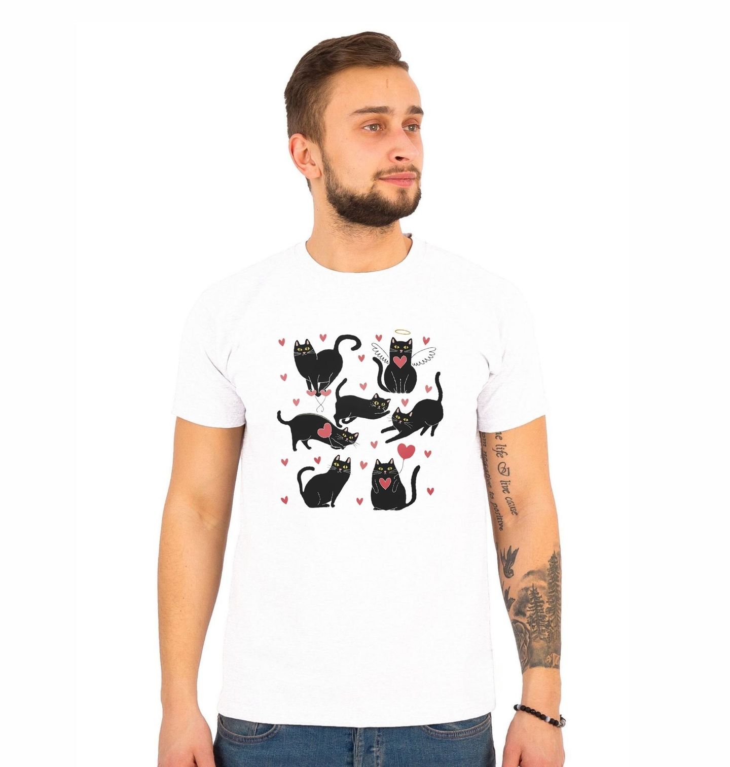 Pánské tričko Romantická Kočka. Tahle černá kočka není symbolem smůly – ale lásky. A hodně! Stylový motiv plný něžných srdcí, balónků a kočičí elegance přináší na tohle tričko pozitivní energii, kterou si zamiluješ na první pohled (nebo mňouknutí).