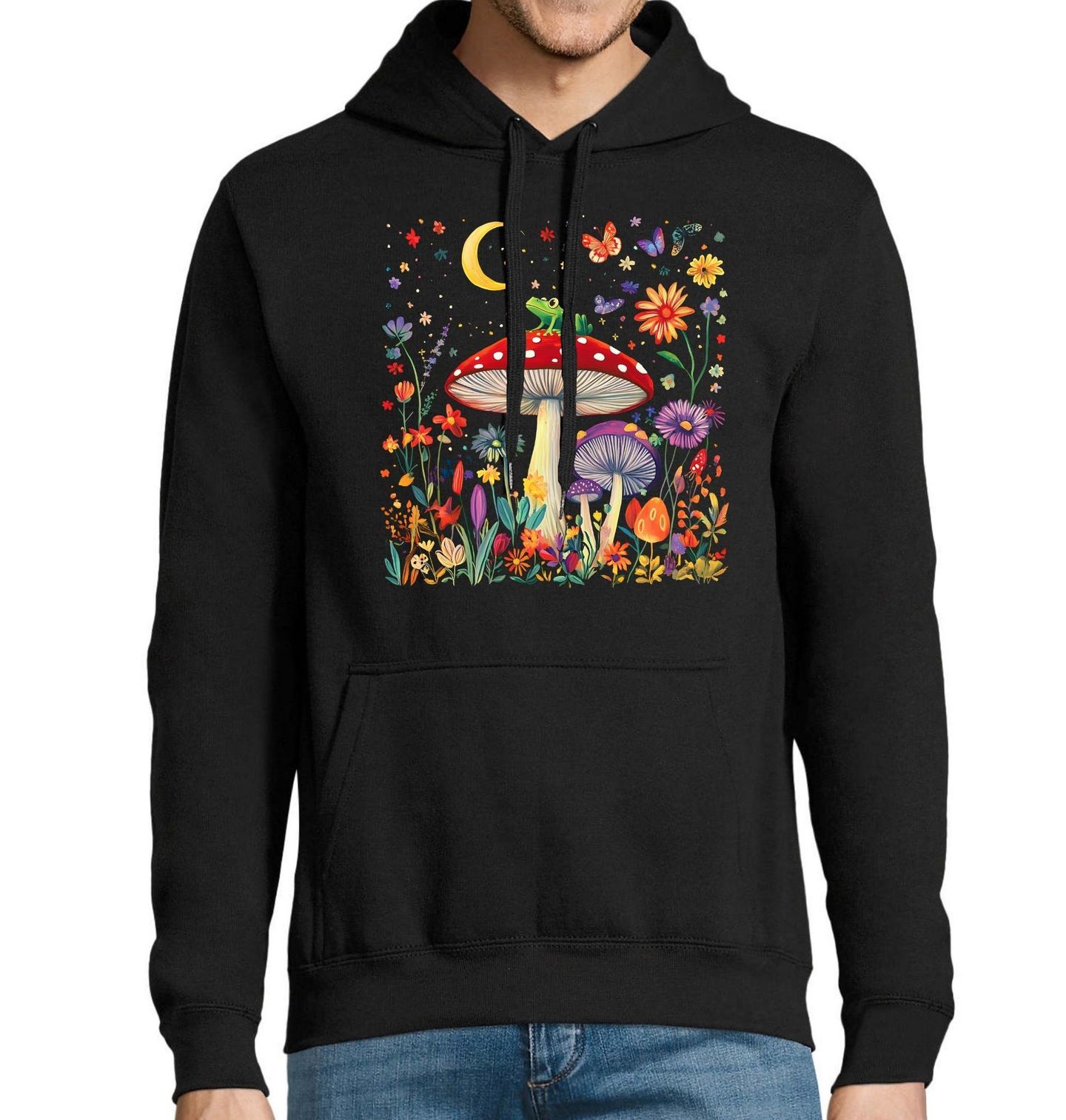 Pánská mikina Rosnička Zelená na Mochomůrce. Barevný a hravý motiv, kde žába sedí na výrazné mochomůrce uprostřed kouzelné noční scenérie. Okolí tvoří pestré houby, rozkvetlé květiny a třpytivá obloha, nad kterou září klidný měsíc. Celý design působí pohádkově a živě – žába, houby, mochomurka i měsíc vytvářejí jedinečnou kombinaci přírody a fantazie. Ideální volba pro milovníky veselých ilustrací, lesních motivů a barevné originality.