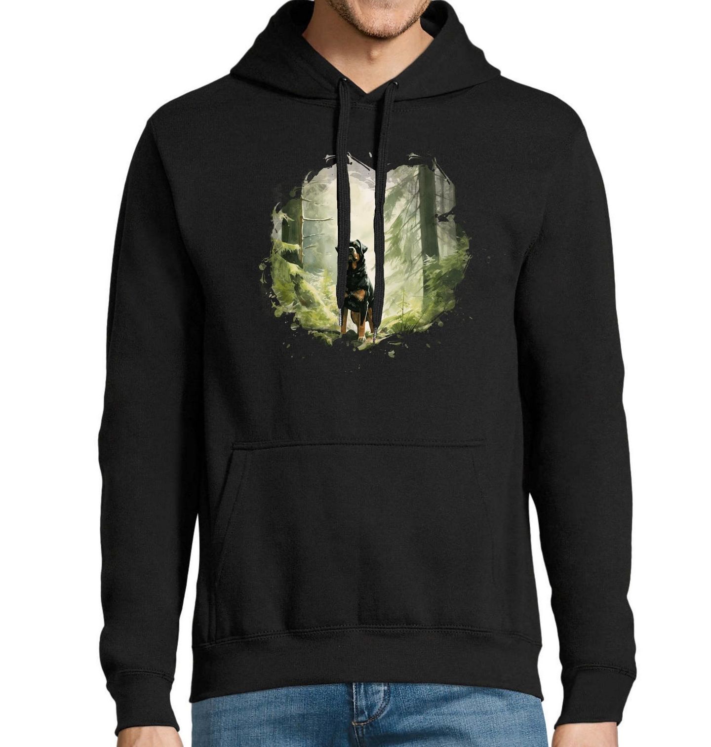 Pánská mikina Rotvajler Tichý strážce lesa. Tento dechberoucí motiv zachycuje mohutného Rotvajlera uprostřed hlubokého lesa, kde vypadá jako tichý ochránce přírody. Pokud jsi pejskař, který miluje výlety, toulky lesem a silné psí osobnosti, tenhle design tě chytne za srdce. Pes na ilustraci vyzařuje klid, sílu a loajalitu – vlastnosti, které každý správný pejskař u Rotvajlera obdivuje.