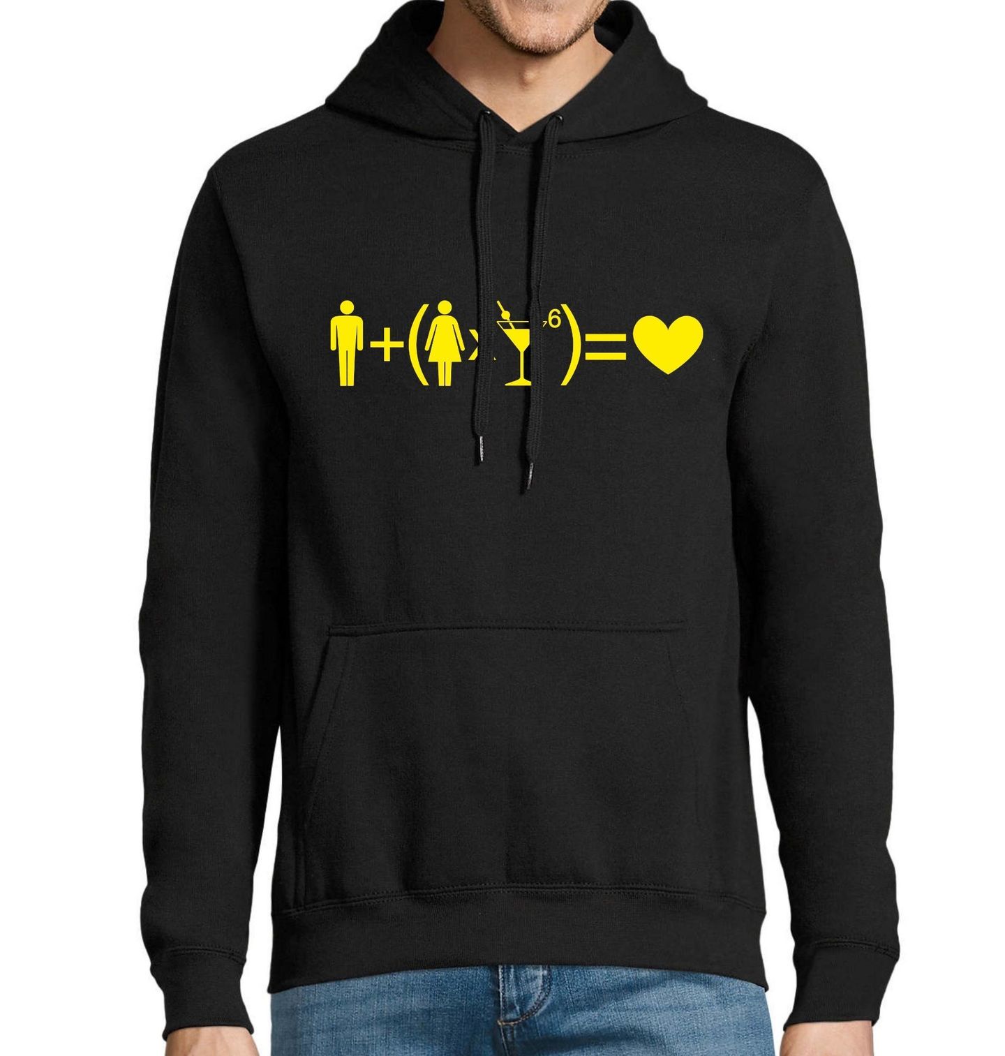 Pánská mikina Rovnice Lásky. Chcete znát tajemství lásky? Muž + žena × šest drinků = zaručená láska. Ideální pro každého, kdo má rád humor, rovnice, alkohol a trošku nadsázky. Perfektní dárek na párty, rozlučky se svobodou nebo jen tak na pobavení. Pokud věříte, že k lásce někdy stačí správný počet koktejlů, tohle je přesně pro vás!