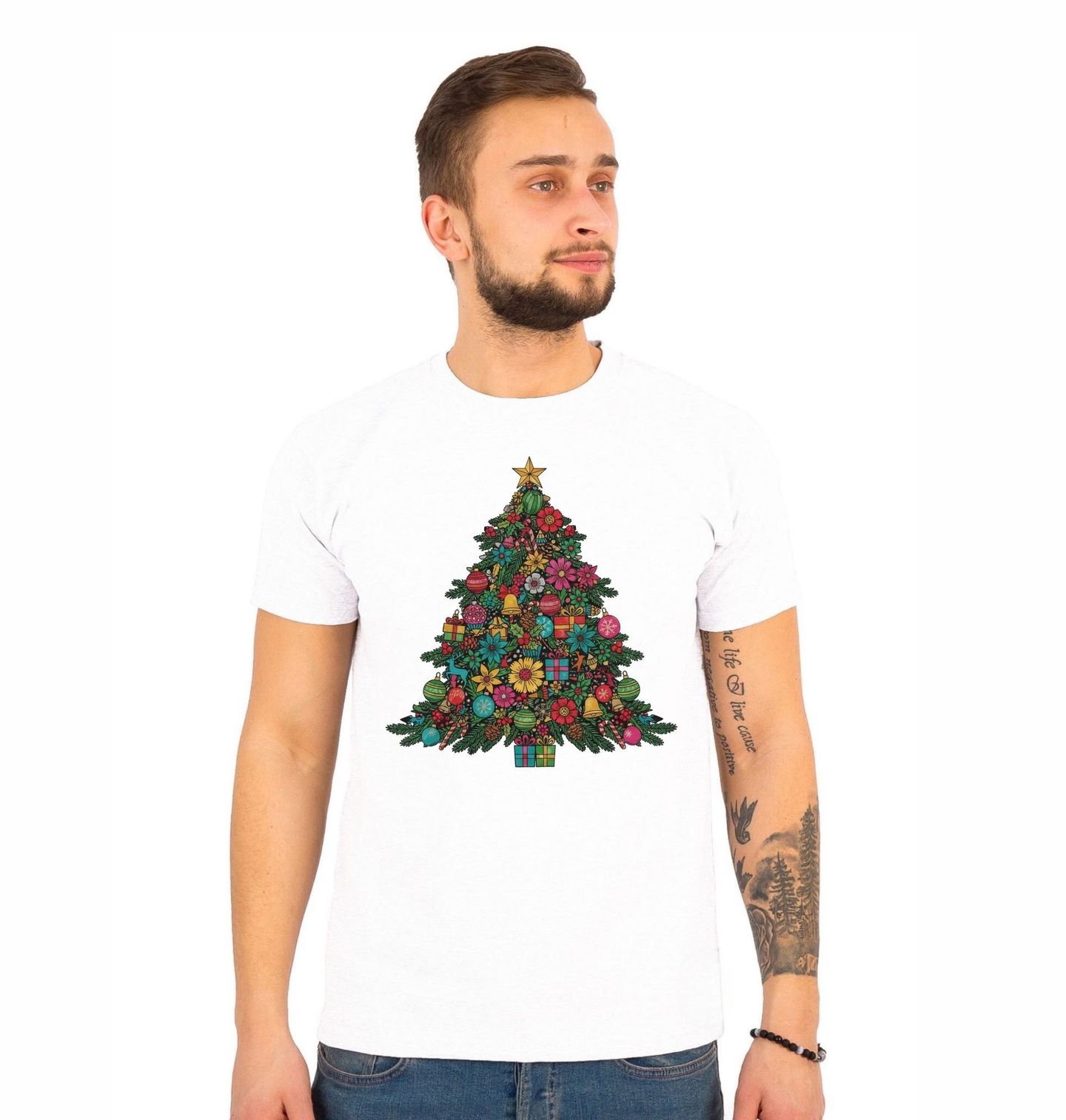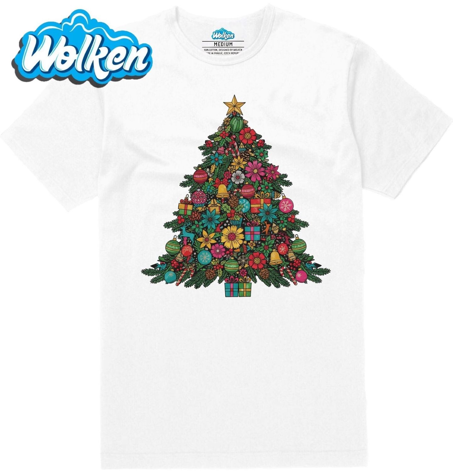 Pánské tričko Rozkvetlý Vánoční Strom. Vánoce zde nejsou jen o stromečku a dárcích, ale i o barvách, květinách a radosti. Ručně kreslený motiv vánočního stromu je tvořen detailně propracovanými květy, baňkami, šiškami, dárky, zvonky a hvězdou na vrcholu.