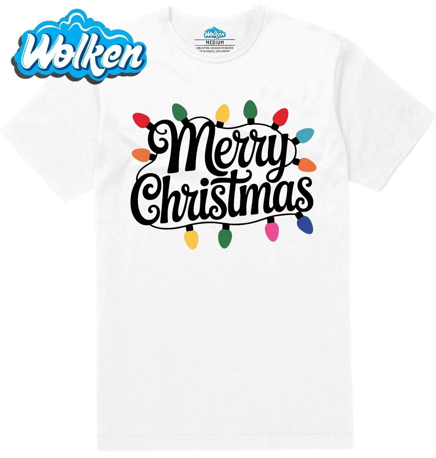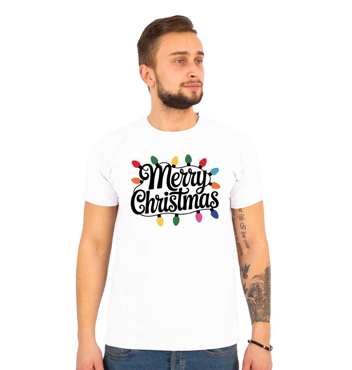 Pánské tričko Rozsvícené Vánoce. Vánoce září v plné kráse! Stylový motiv s nápisem Merry Christmas, který je obklopený barevnými vánočními světýlky, přináší tu pravou sváteční atmosféru. Perfektní design pro každého, kdo miluje hravé Vánoce plné barev, radosti a světla.