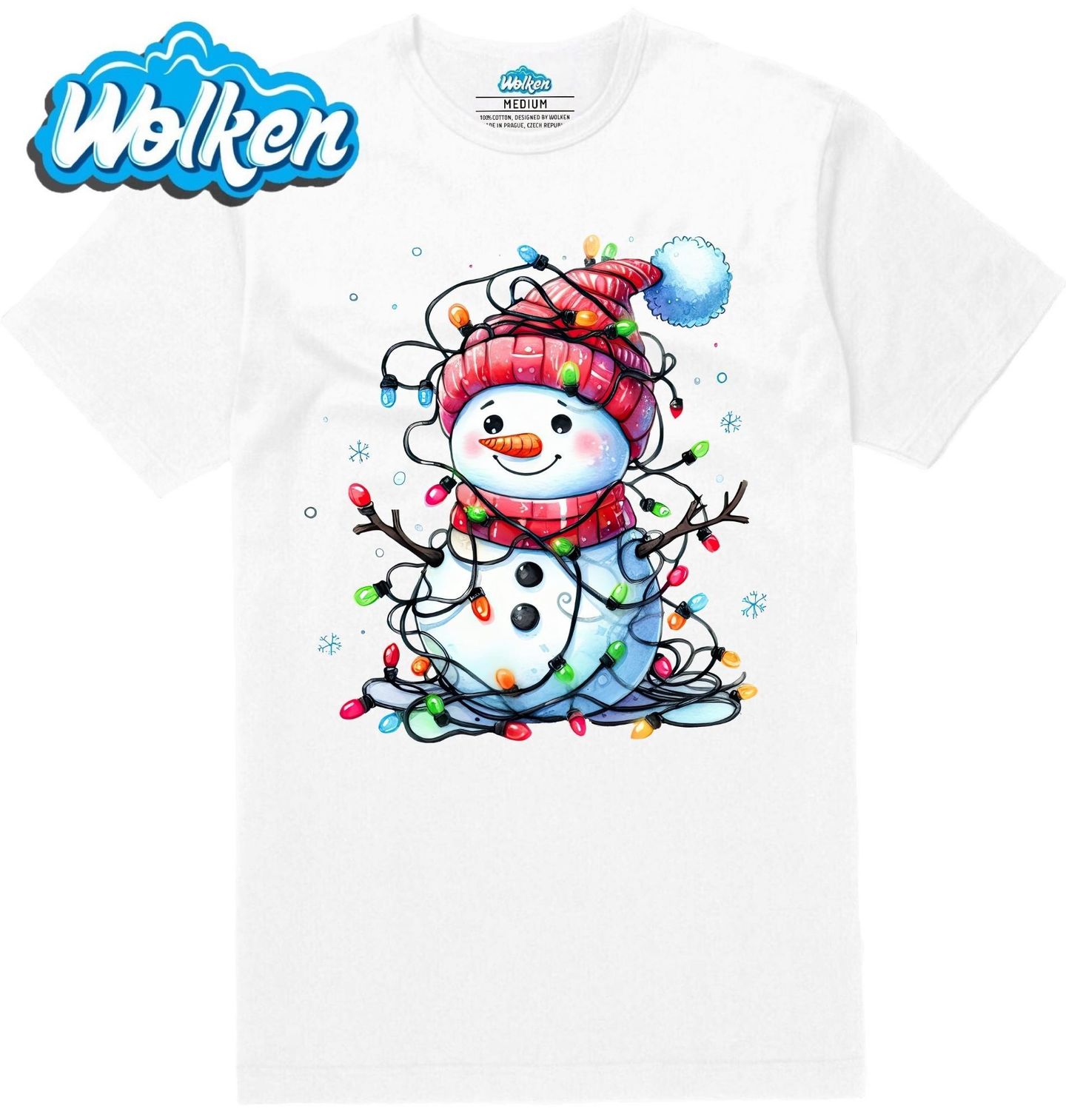 Pánské tričko Rozsvícený Sněhulák. Vánoce bez chaosu? To by nebylo ono! Tento roztomilý motiv zachycuje sněhuláka, který se tak nadšeně pustil do vánoční výzdoby, až se úplně zamotal do světýlek. Perfektní dárek pro všechny, kdo milují Vánoce, humor a zimní pohodu.