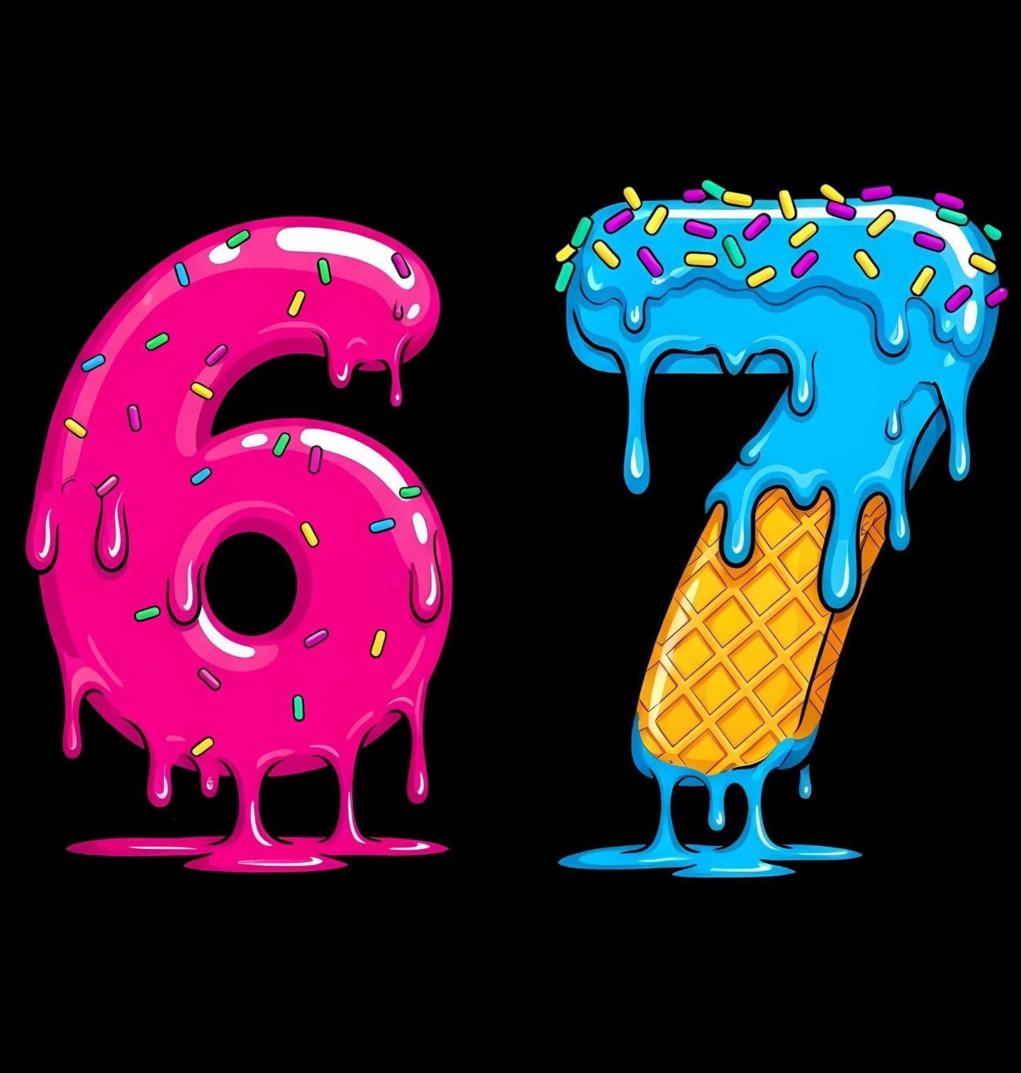 Pánské tričko Rozteklá Zmrzlina 67 Six Seven. Na motivu je číslo 67 vytvořené ve sladkém stylu. Šestka je růžová, pokrytá polevou a posypaná barevným zdobením, které připomíná zmrzlina. Sedmička je navržená jako kornout se zmrzlinou s modrou polevou a barevným posypem. Celý design působí hravě a vtipně jako meme a zároveň odkazuje na výraz six seven.