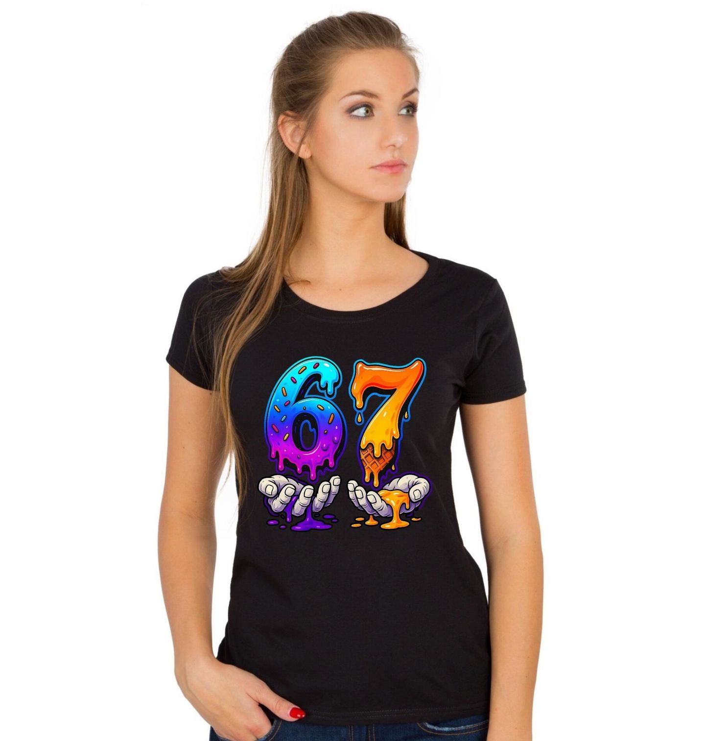 Dámské tričko Rozteklá Zmrzlina v Dlaních 67 Six Seven. Originální motiv s číslem 67 ve stylu sladkého meme – barevná zmrzlina se rozplývá přímo do natažených dlaní a vytváří hravou, lehce bláznivou atmosféru. Skvělé pro všechny, kterým číslo 67 nebo six seven něco znamená a zároveň milují humor, barvy a sladké motivy.