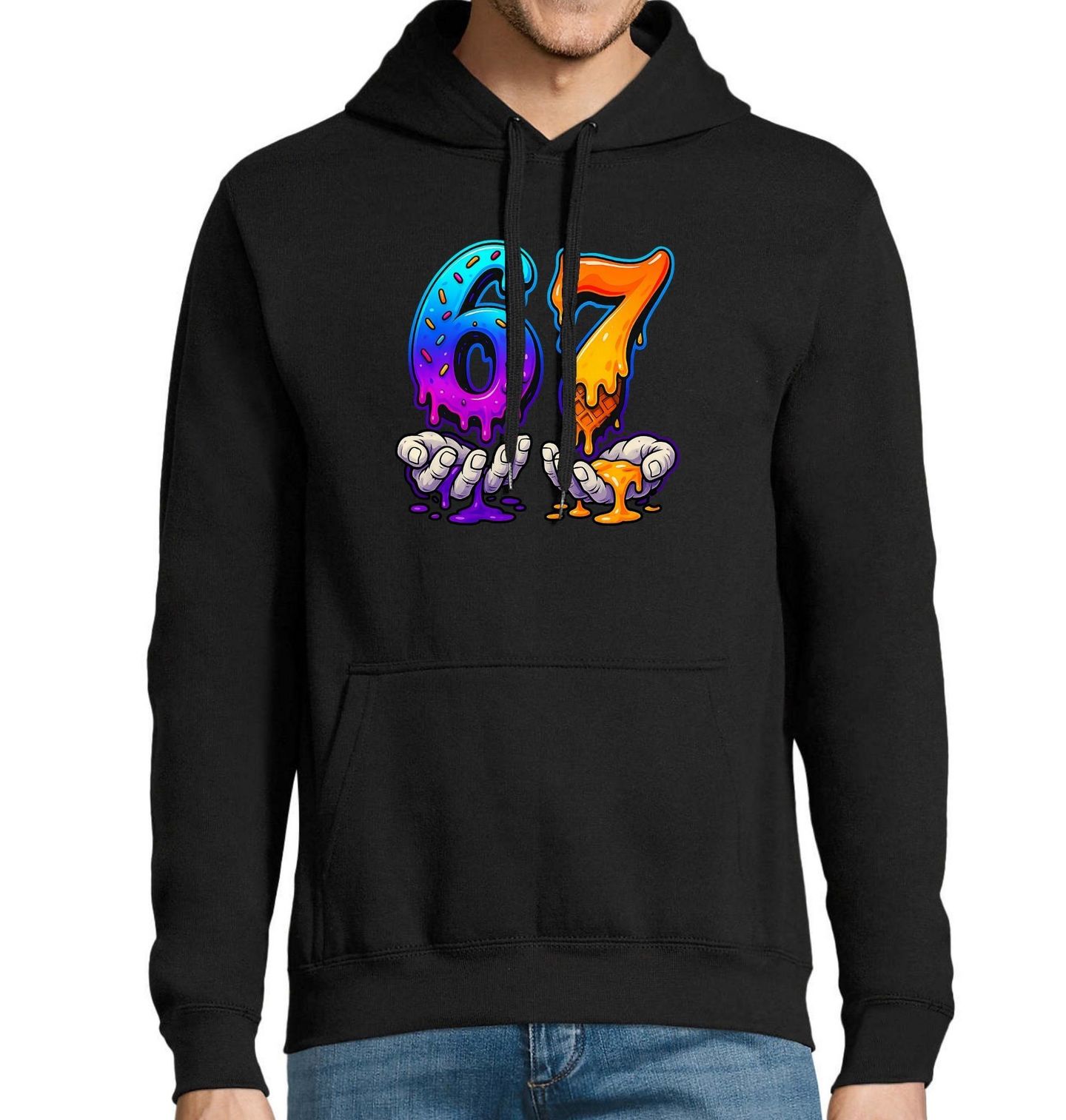 Pánská mikina Rozteklá Zmrzlina v Dlaních 67 Six Seven. Originální motiv s číslem 67 ve stylu sladkého meme – barevná zmrzlina se rozplývá přímo do natažených dlaní a vytváří hravou, lehce bláznivou atmosféru. Skvělé pro všechny, kterým číslo 67 nebo six seven něco znamená a zároveň milují humor, barvy a sladké motivy.