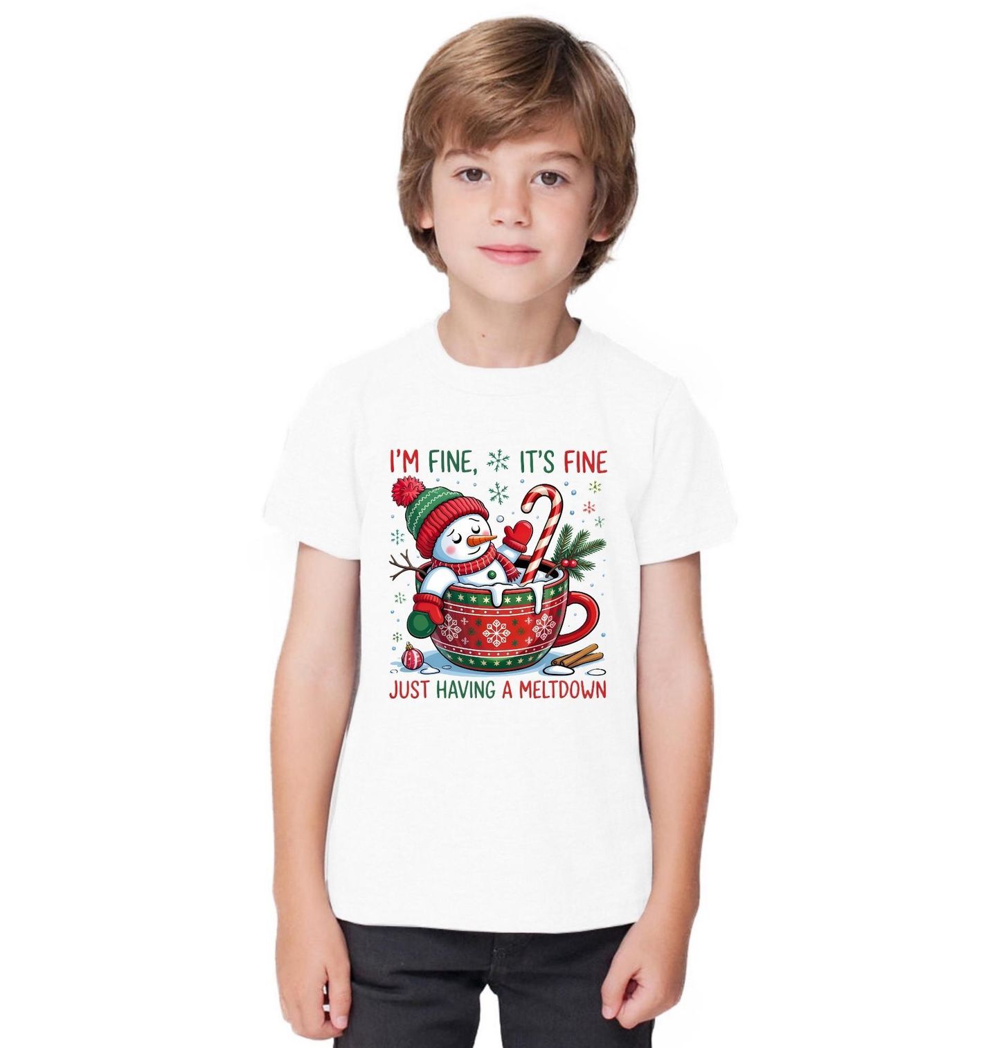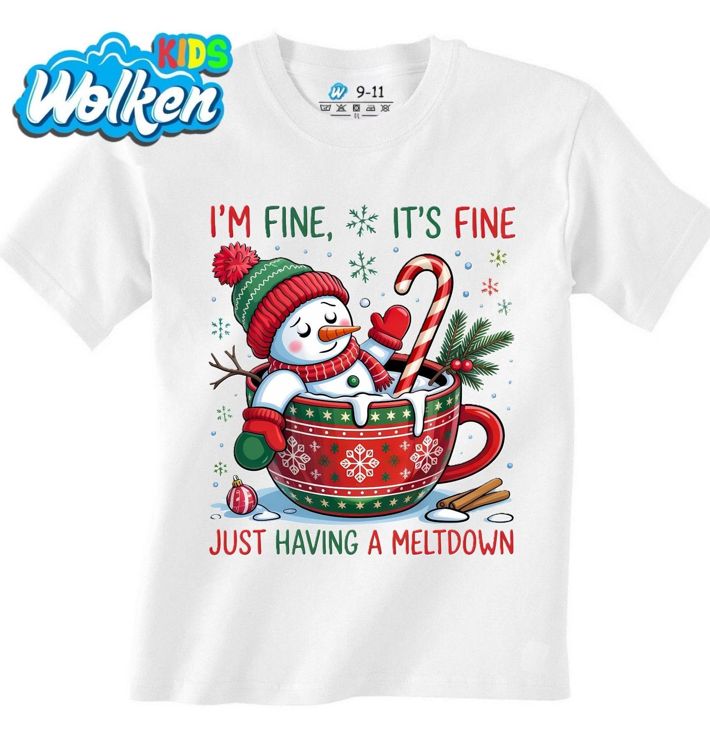 Dětské tričko Rozteklý Sněhulák v Šálku. "I'M FINE, IT'S FINE - JUST HAVING A MELTDOWN" česky: "Jsem v pohodě, je to v pohodě - jen mám menší záchvat". Je to parodie na "breakdown", tedy zhroutění - ale místo člověka se hroutí sněhulák, a to doslova, protože taje v horkém vánočním šálku. Šálek horké kávy a Vánoce můžou začít!