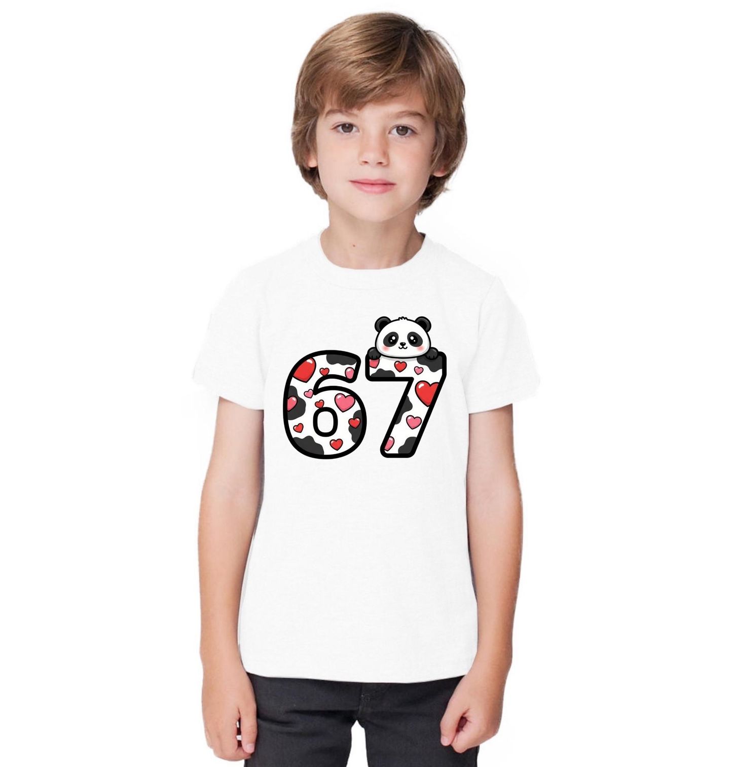 Dětské tričko Roztomilá Panda 67 Six Seven Meme. Roztomilý a hravý motiv 67, který si zamiluje každý fanoušek kawaii stylu! Číslo 67 je vytvořené v hravém designu se vzorem srdce a nahoře vykukuje roztomilá panda s velkýma očima. Ideální pro všechny, kdo milují pozitivní vibrace, roztomilé ilustrace a vtipné meme motivy.