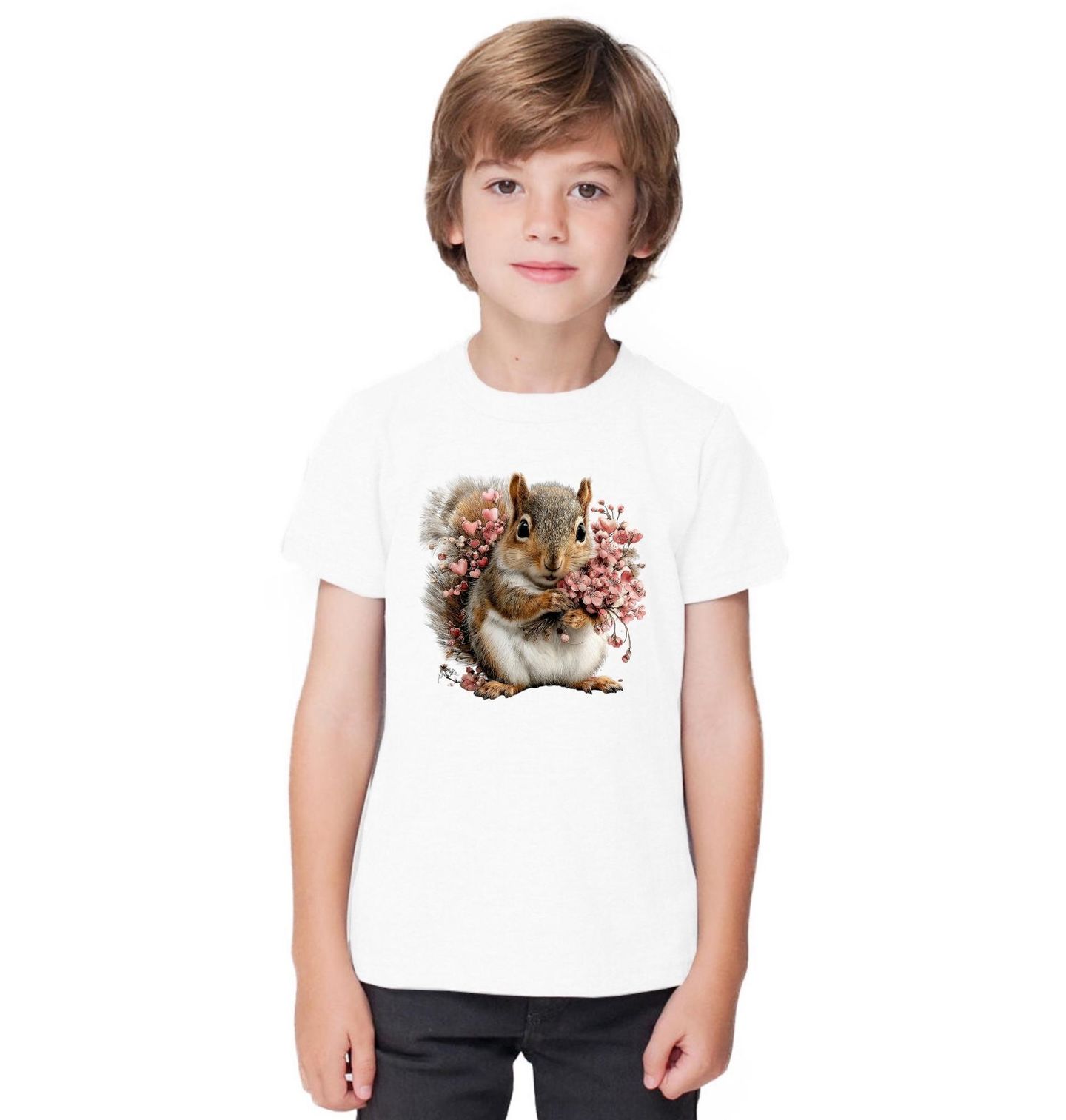 Dětské tričko Roztomilá Veverka s Květinami. Veverka v motivu působí hravě a mile, zatímco květiny dodávají celku lehkost a jemnou eleganci. Design je ideální pro všechny, kdo mají rádi zvířecí motivy, přírodu a jemnou ilustraci s romantickým nádechem. Hodí se jako veselý a přívětivý motiv, který potěší na první pohled.