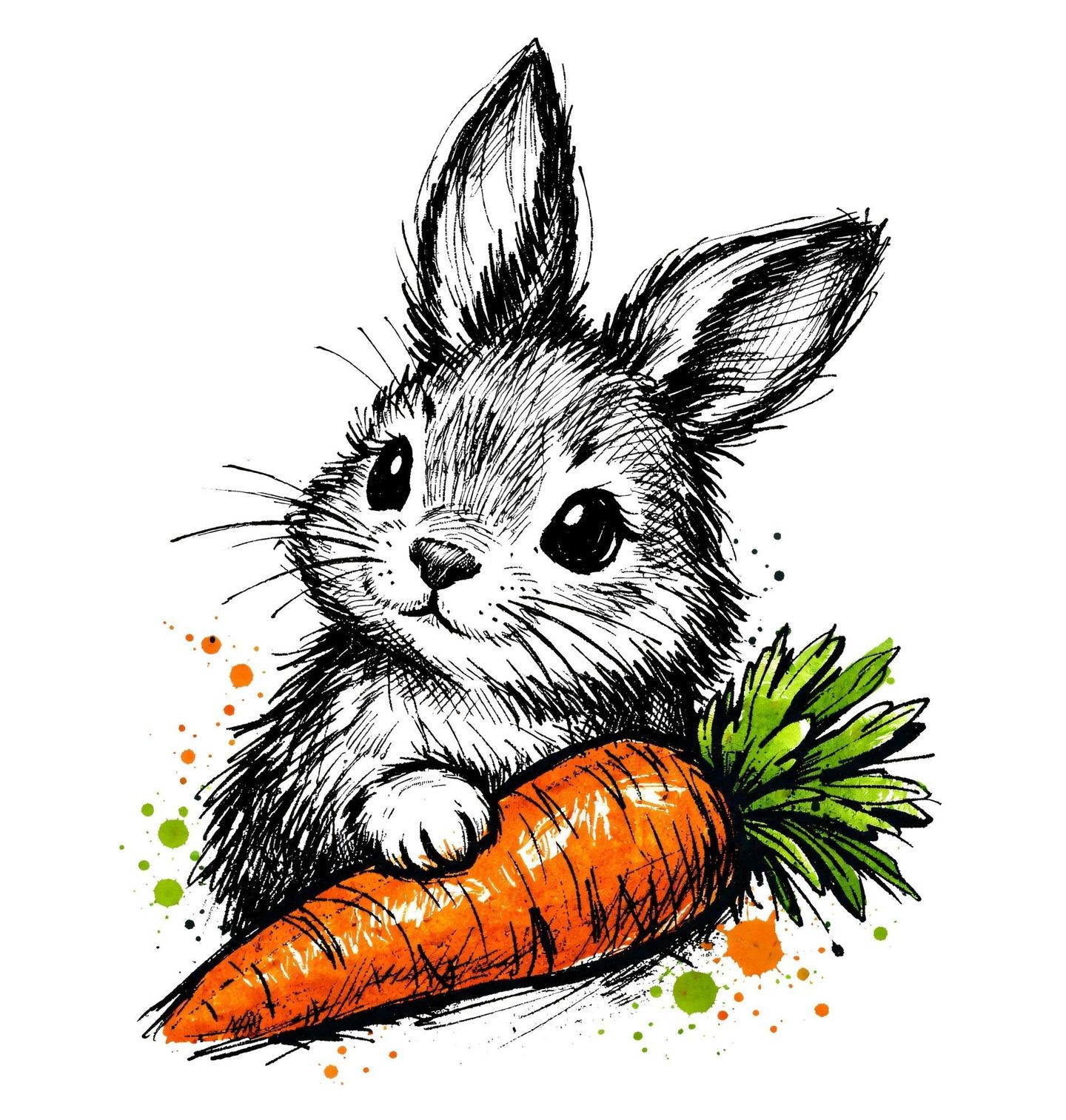 Dětské tričko Roztomilý Králíček s Mrkví. Krásný a jemný motiv zachycuje roztomilého králík, který si drží svou oblíbenou pochoutku – čerstvou mrkev. Styl kresby kombinuje ruční ilustraci s barevnými akcenty, díky čemuž působí design živě, hravě a zároveň elegantně. Tento králík s výraznýma očima a detailním zpracováním zaujme každého milovníka zvířat. Výrazná mrkev dodává motivu svěží energii a symbolizuje přírodu, jednoduchost a radost z maličkostí.