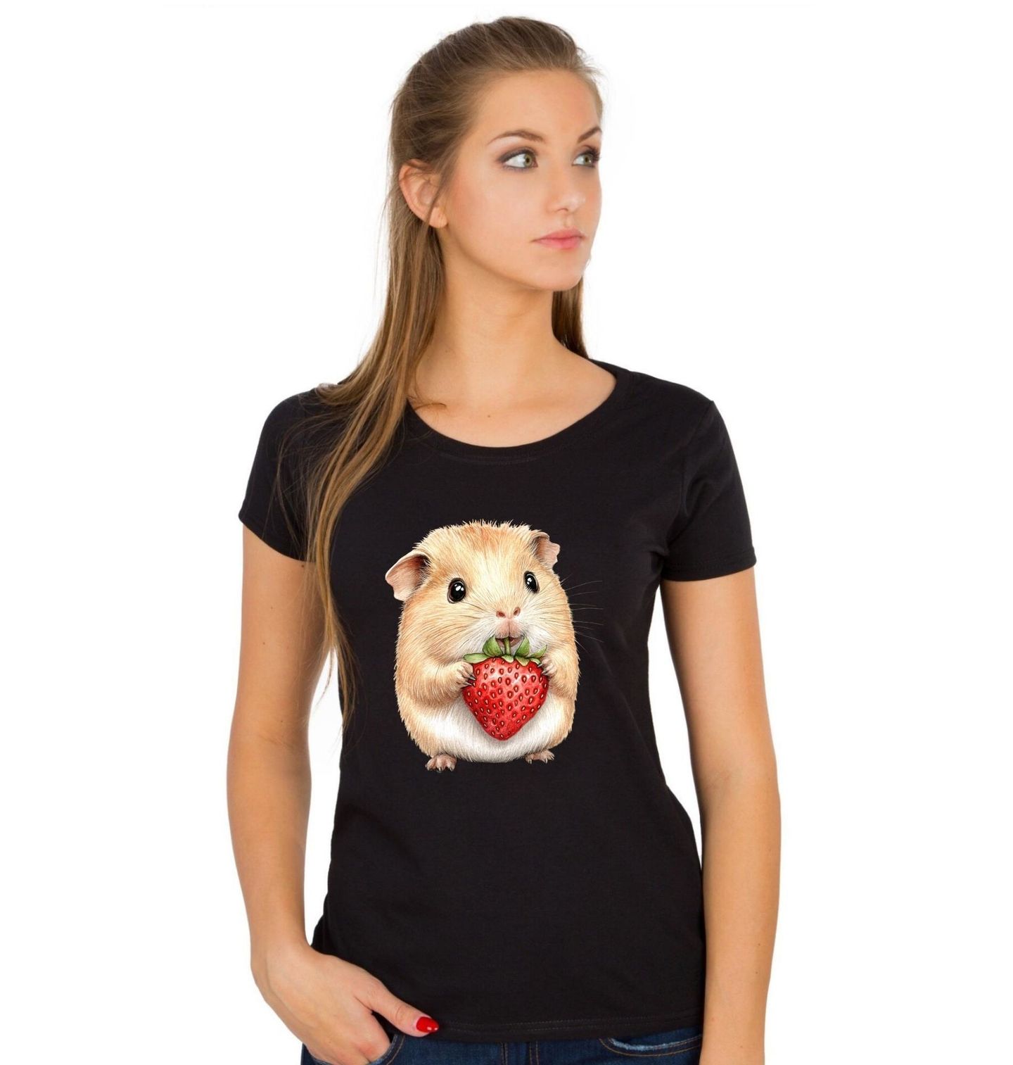 Dámské tričko Roztomilý Křeček s Jahodou. Rozkošný motiv, ve kterém je hlavní hvězdou malý chlupatý křeček, které drží šťavnatou červenou jahoda. Ilustrace působí jemně, hravě a okouzlí každého milovníka těchto přátelských tvorečků. Pokud ti křeček dělá radost každý den a jahoda patří mezi tvé oblíbené dobroty, tenhle motiv je přesně pro tebe.
