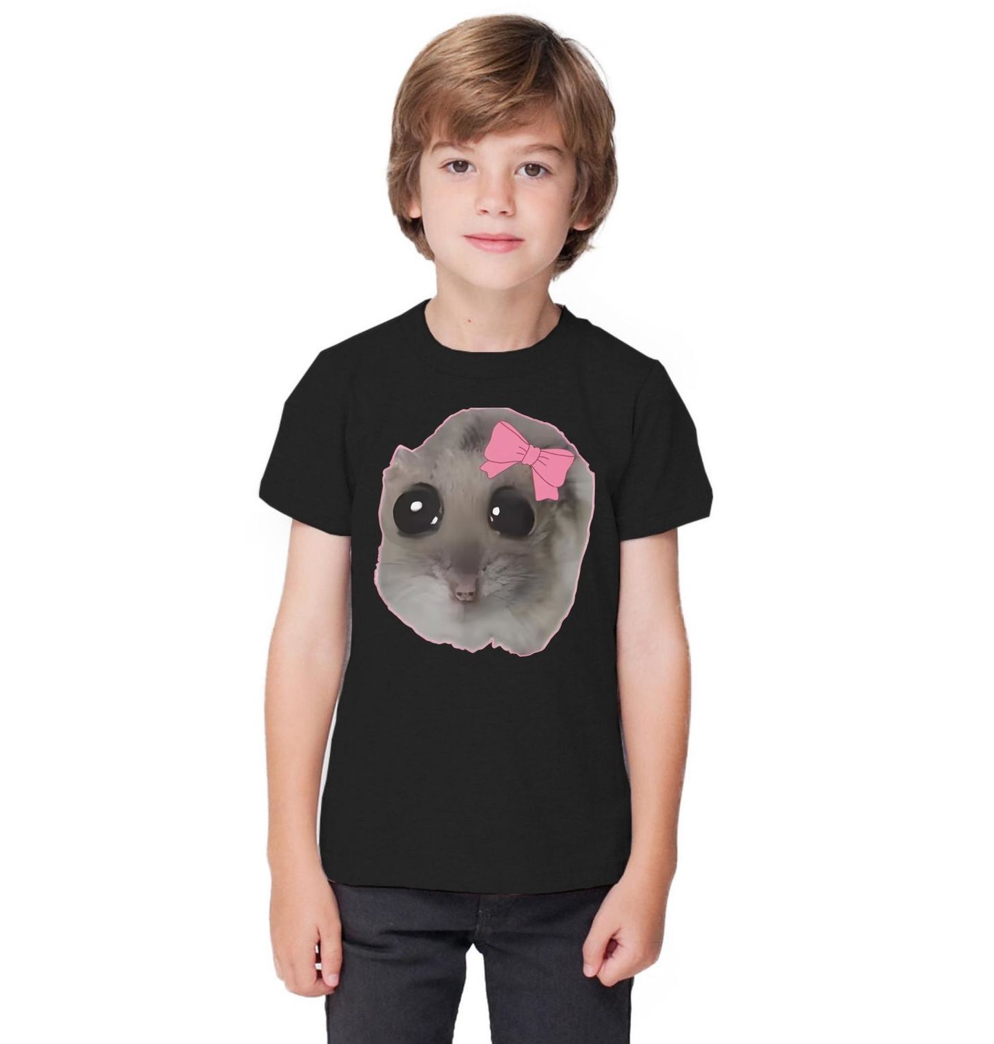 Dětské tričko Roztomilý Křeček s Mašlí Sad Hamster Meme. Extrémně roztomilý motiv zobrazuje křečka s velkýma očima a růžovou mašlí. Tento design je ideální pro milovníky zvířat a cute stylu. Minimalistický, ale výrazný vzhled dělá z motivu perfektní doplněk pro každého, kdo má rád roztomilé křečky a zvířecí motivy.