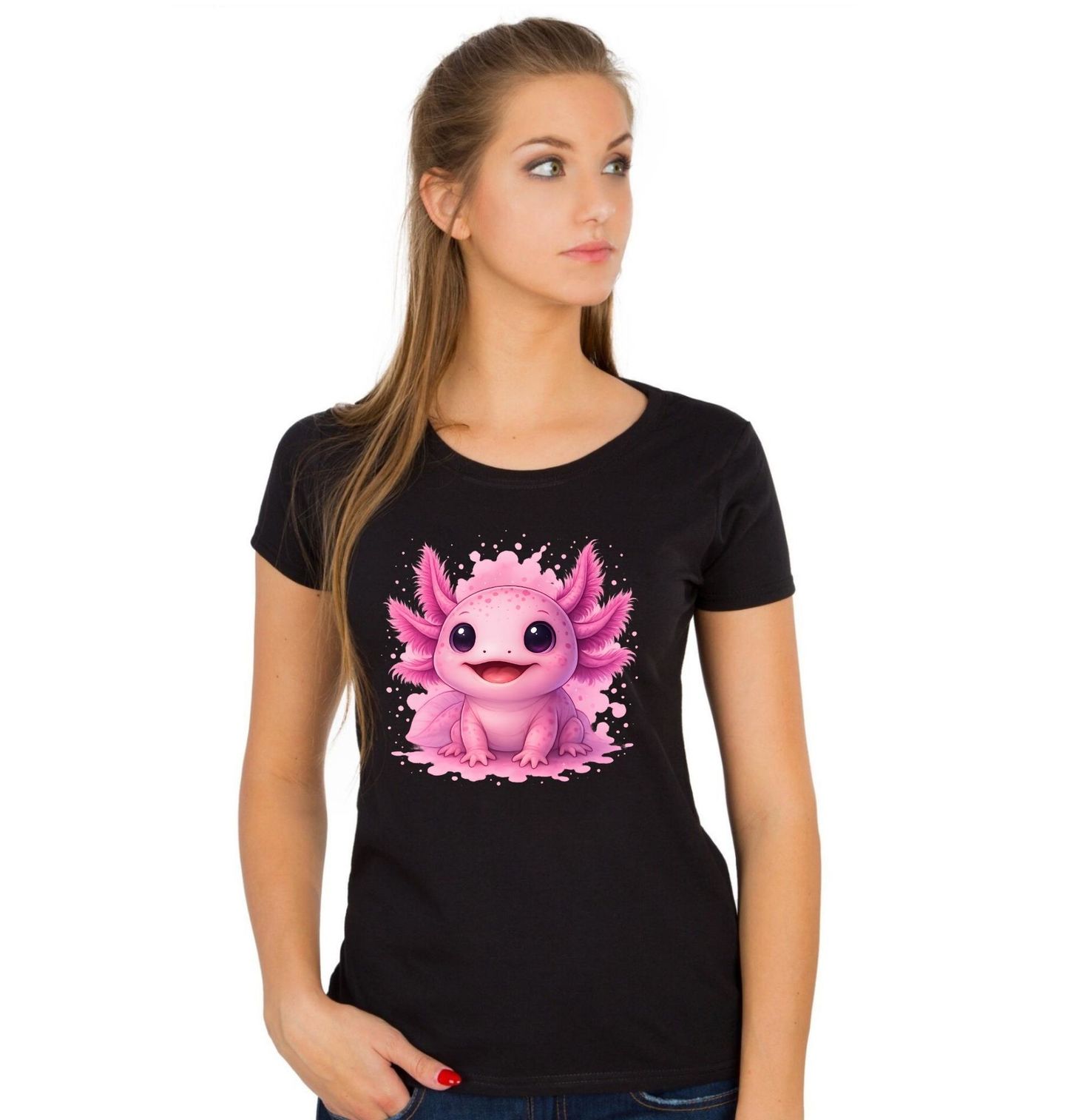 Dámské tričko Roztomilý Růžový Axolotl. Tenhle neodolatelně roztomilý motiv zachycuje růžového tvorečka jménem axolotl s obrovskýma zářícíma očima a širokým úsměvem. Jemné růžové odstíny a hebký, skoro plyšový vzhled dělají z tohoto designu perfektní volbu pro všechny milovníky roztomilých zvířat a pozitivní energie.