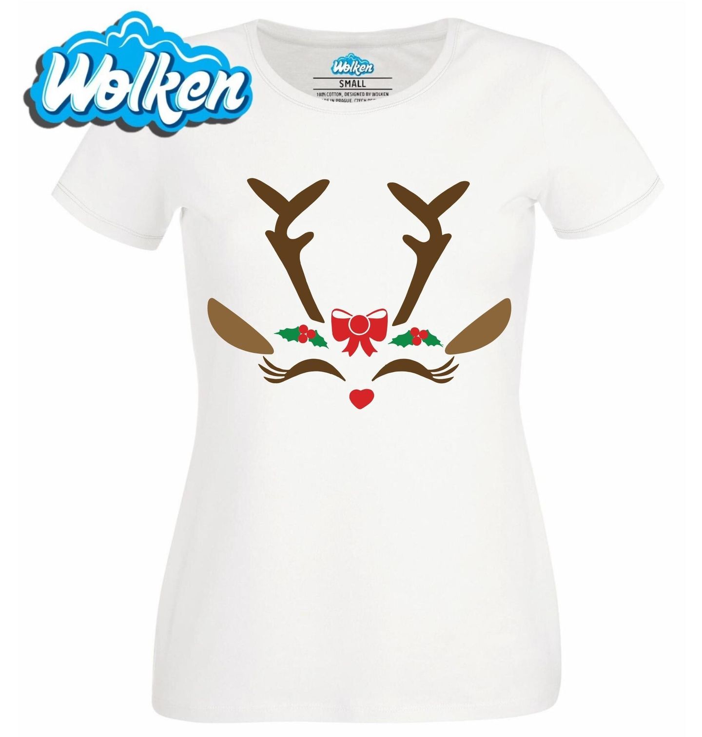 Dámské tričko Roztomilý Vánoční Sob. Vánoce jsou časem radosti, kouzel a třpytivých detailů. Tento elegantní motiv sobí tváře s parožím, mašlí a cesmínou je dokonalým symbolem sváteční atmosféry. Jemný design s řasami a srdíčkem jako čumáčkem působí hravě a roztomile.