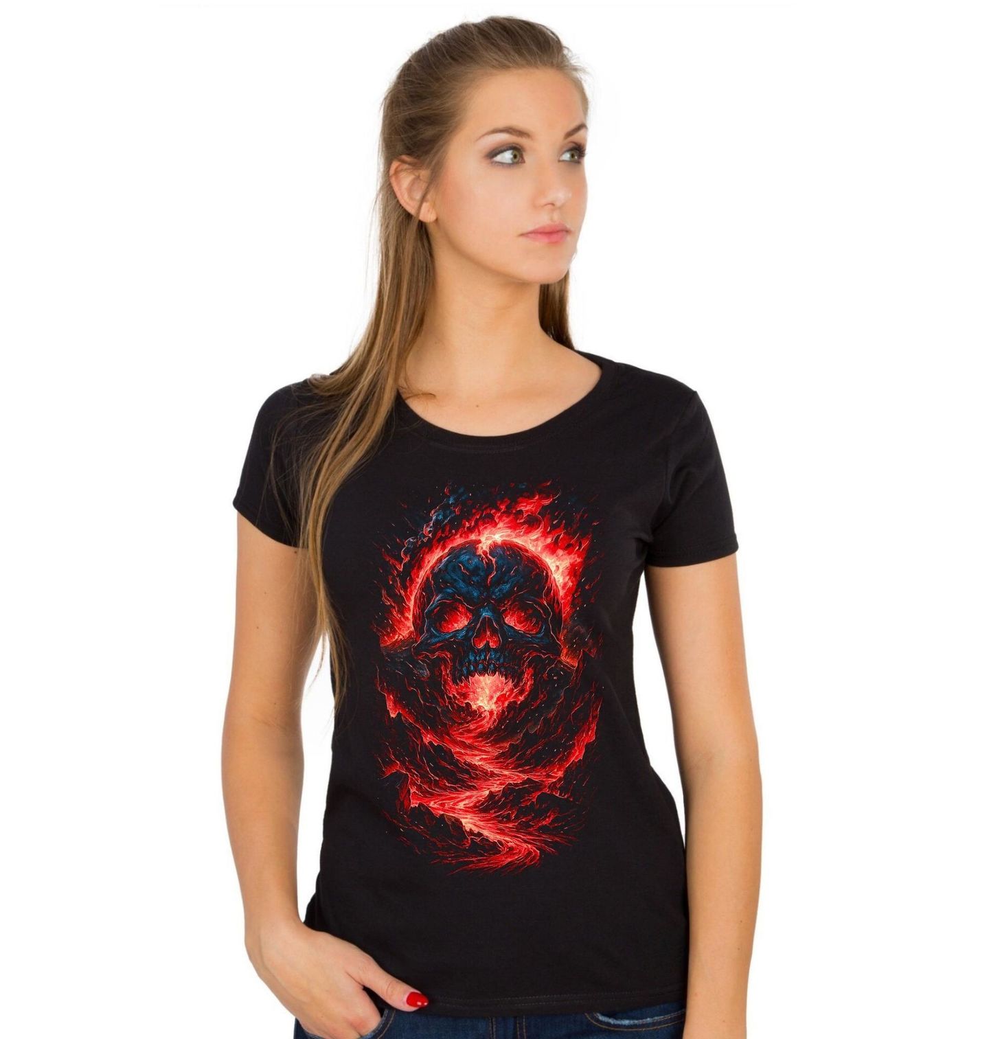 Dámské tričko Rozžhavená Lebka v Lávě. Extrémně výrazný a dynamický motiv, který zobrazuje kostlivec zrozený z ničivé síly přírody. Rozžhavená láva proudí jeho tělem a vytváří fascinující vizuální efekt plný energie, chaosu a síly. Ohnivé barvy a dramatická kompozice dodávají designu intenzivní atmosféru, která okamžitě upoutá pozornost. Tento design je ideální pro milovníky dark artu, fantasy stylu a výrazných motivů, které vyzařují energii a sílu.