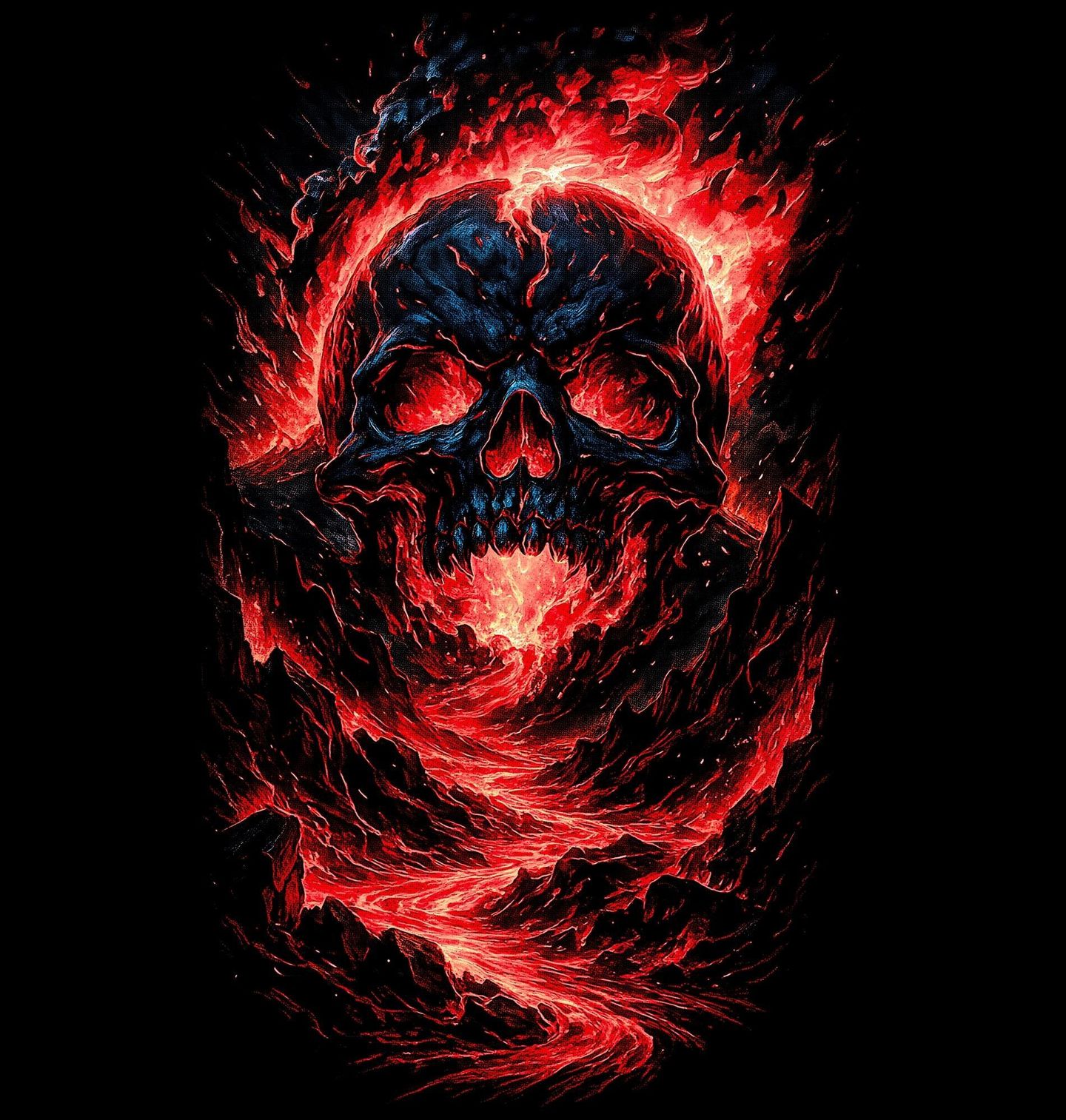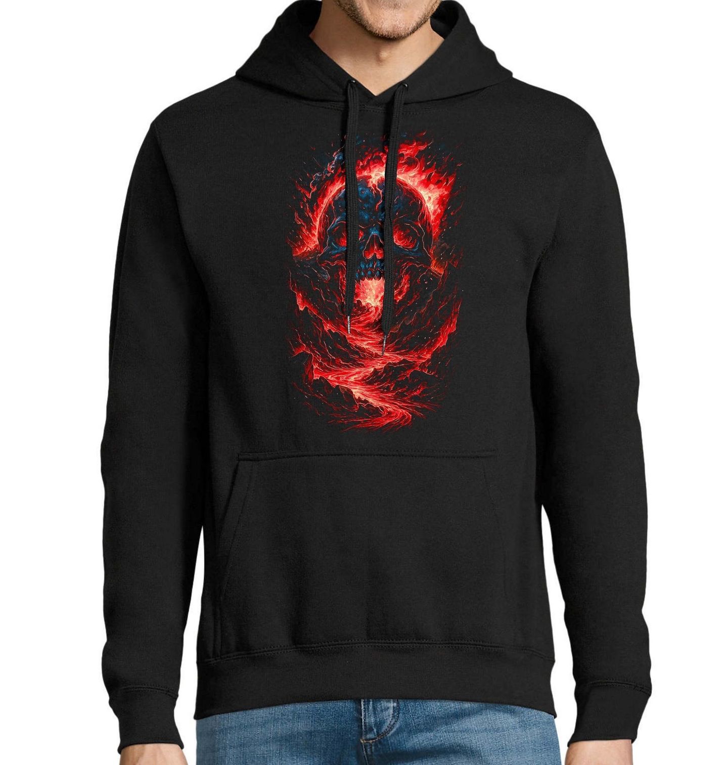 Pánská mikina Rozžhavená Lebka v Lávě. Extrémně výrazný a dynamický motiv, který zobrazuje kostlivec zrozený z ničivé síly přírody. Rozžhavená láva proudí jeho tělem a vytváří fascinující vizuální efekt plný energie, chaosu a síly. Ohnivé barvy a dramatická kompozice dodávají designu intenzivní atmosféru, která okamžitě upoutá pozornost. Tento design je ideální pro milovníky dark artu, fantasy stylu a výrazných motivů, které vyzařují energii a sílu.