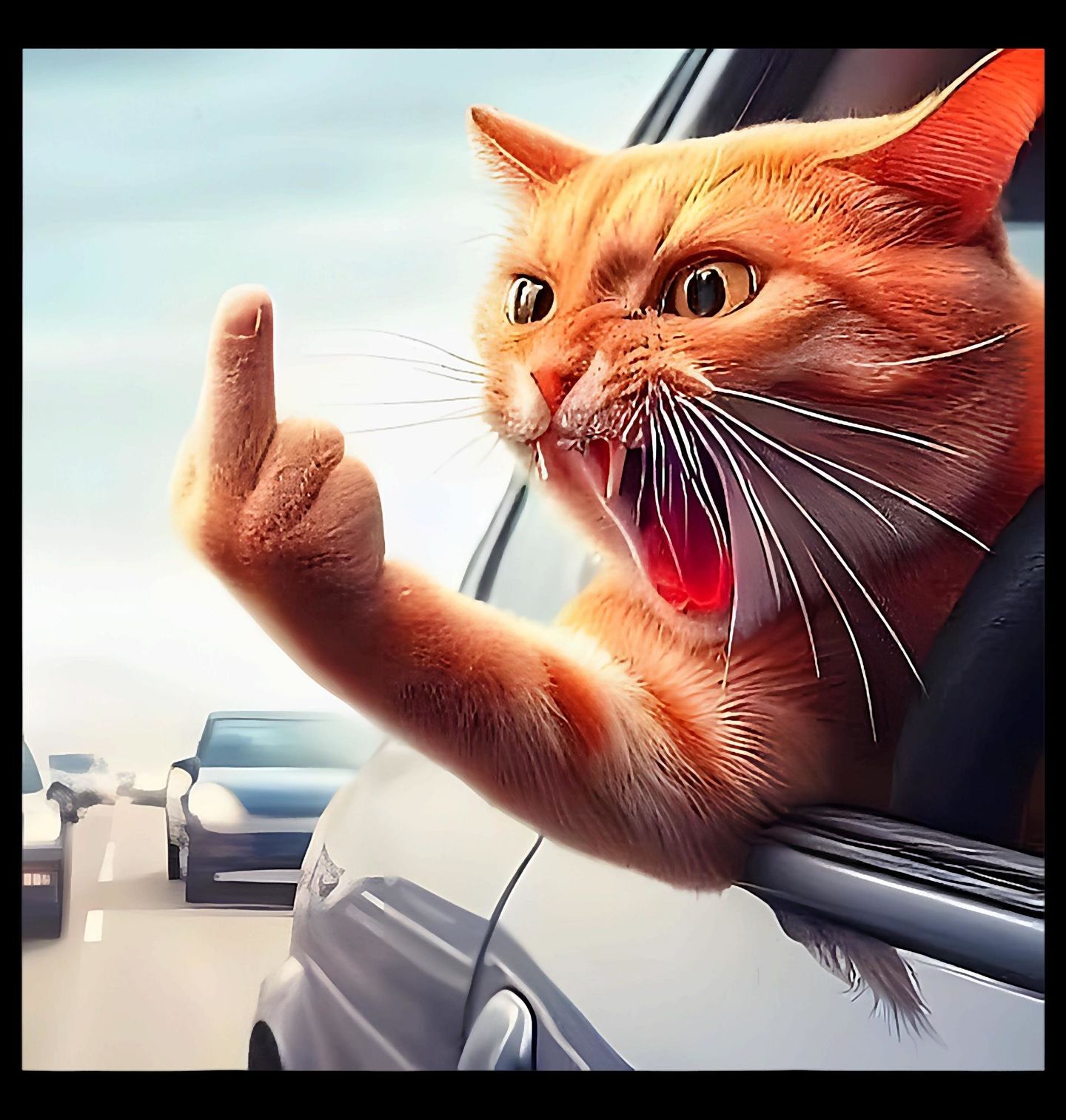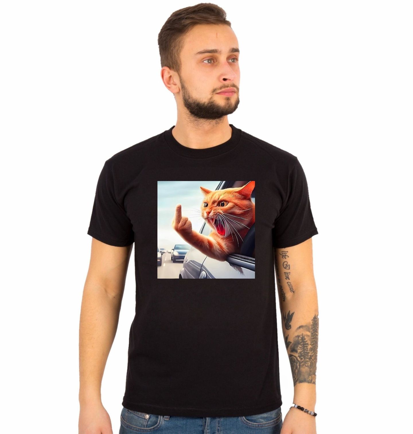 Pánské tričko Rozzuřená Kočka na Dálnici. Tahle kočka už má všeho dost. Sedí v autě, je naštvaná, a prostředníček jí rozhodně není cizí. Pokud tě štve doprava, lidé, nebo prostě pondělí – tenhle potisk ti bude rozumět líp než tvůj terapeut.